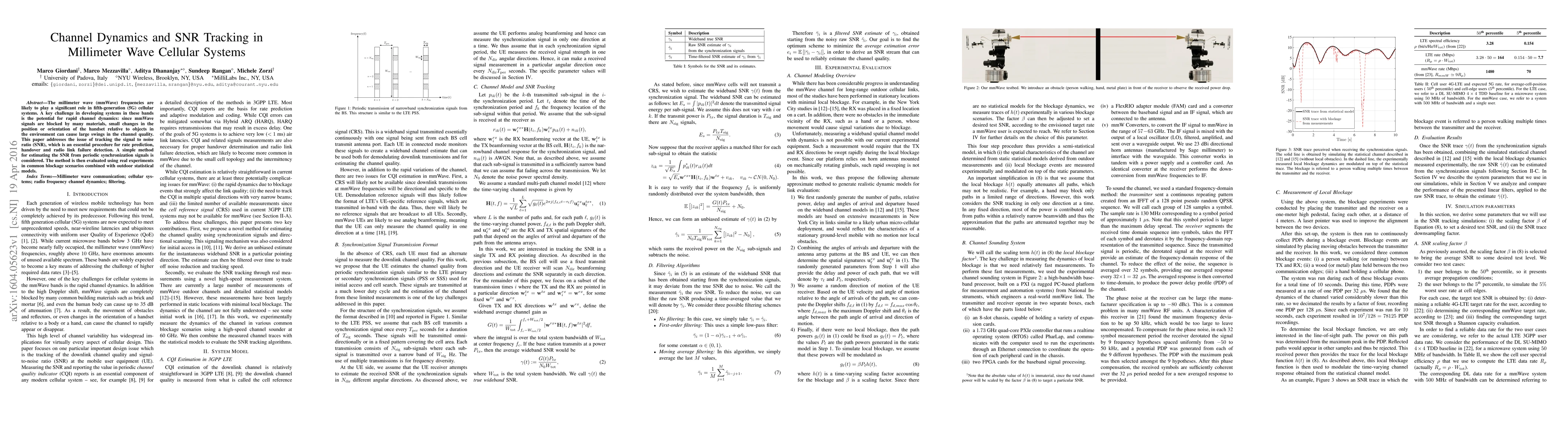 The millimeter wave (mmWave) frequencies are likely to play a significant role in fifth-generation (5G) cellular systems. A key challenge in developing systems in these bands is the potential for rapid channel dynamics: since mmWave signals are blocked by many materials, small changes in the position or orientation of the handset relative to objects in the environment can cause large swings in the channel quality. This paper addresses the issue of tracking the signal to noise ratio (SNR), which is an essential procedure for rate prediction, handover and radio link failure detection. A simple method for estimating the SNR from periodic synchronization signals is considered. The method is then evaluated using real experiments in common blockage scenarios combined with outdoor statistical models.