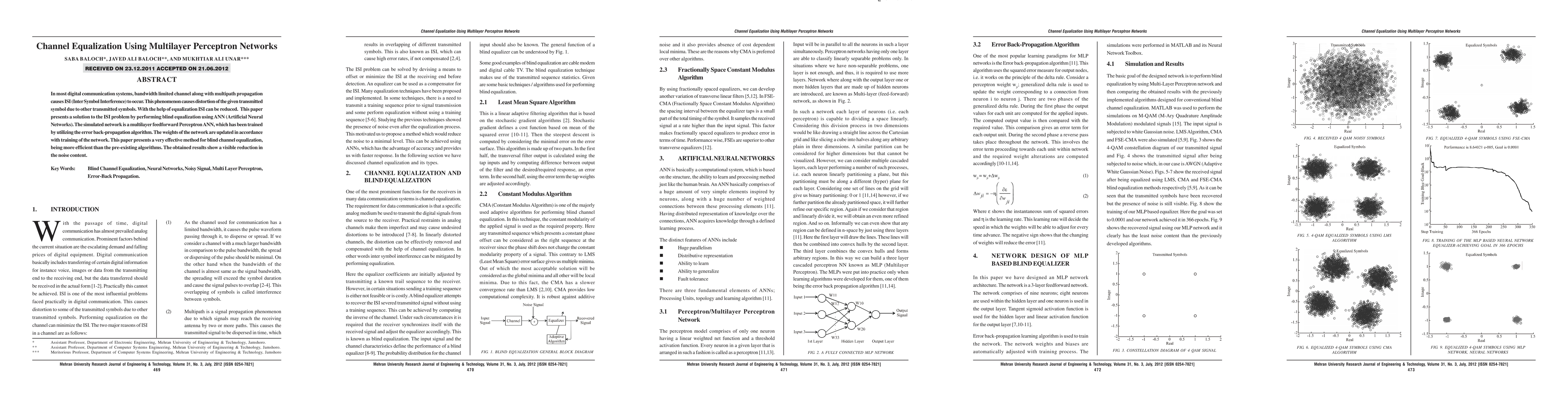 This paper proposes a solution for reducing Inter Symbol Interference (ISI) in digital communication systems using a multilayer perceptron neural network for blind equalization. The network, trained via error backpropagation, demonstrates superior efficiency and noise reduction compared to existing algorithms.