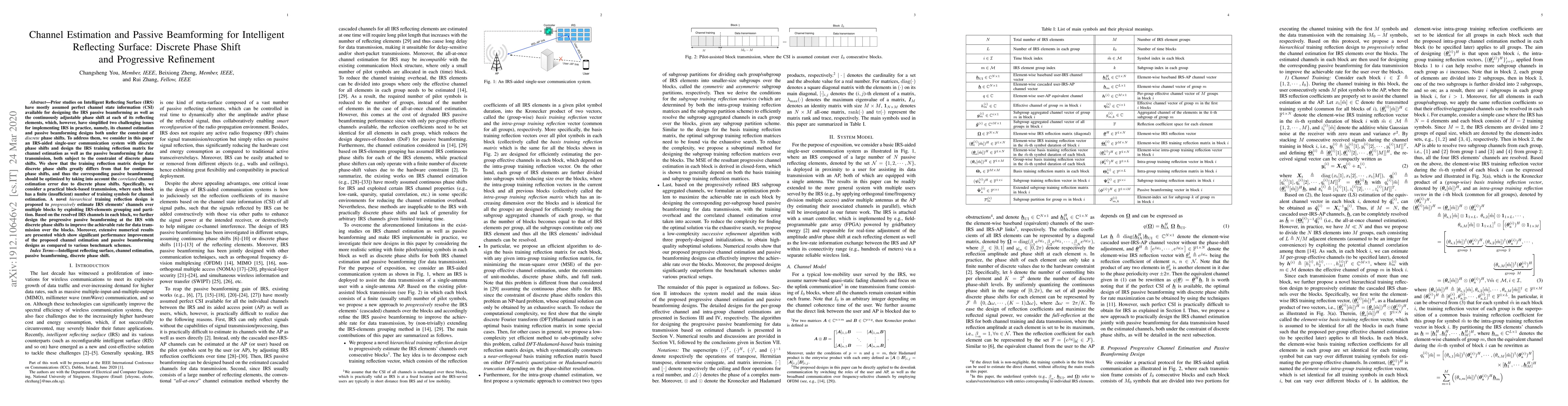 This paper addresses the challenges of channel estimation and passive beamforming in Intelligent Reflecting Surface (IRS) systems with discrete phase shifts. It proposes a hierarchical training reflection design to progressively estimate IRS channels and optimizes passive beamforming for data transmission, considering the correlated channel estimation error due to discrete phase shifts.