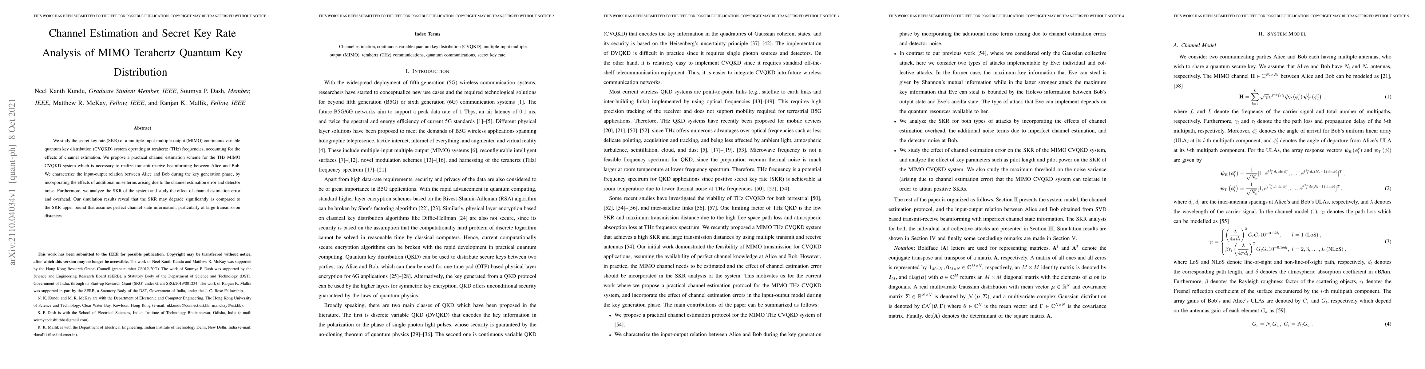 This paper investigates the secret key rate (SKR) of a MIMO continuous variable quantum key distribution system operating at terahertz frequencies, proposing a channel estimation scheme to facilitate beamforming. It analyzes the SKR degradation due to channel estimation errors and overhead, showing significant SKR loss compared to the upper bound at long distances.