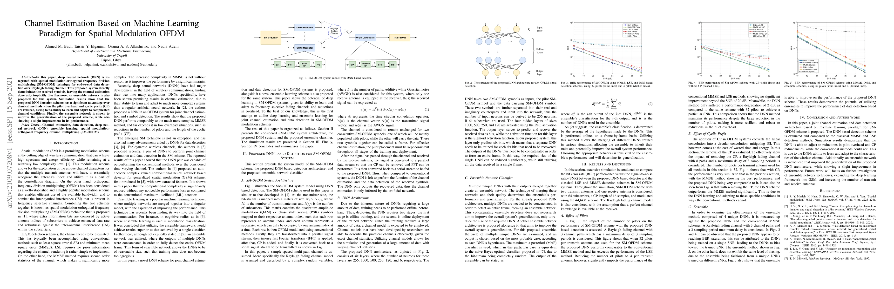 In this paper, deep neural network (DNN) is integrated with spatial modulation-orthogonal frequency division multiplexing (SM-OFDM) technique for end-to-end data detection over Rayleigh fading channel. This proposed system directly demodulates the received symbols, leaving the channel estimation done only implicitly. Furthermore, an ensemble network is also proposed for this system. Simulation results show that the proposed DNN detection scheme has a significant advantage over classical methods when the pilot overhead and cyclic prefix (CP) are reduced, owing to its ability to learn and adjust to complicated channel conditions. Finally, the ensemble network is shown to improve the generalization of the proposed scheme, while also showing a slight improvement in its performance.