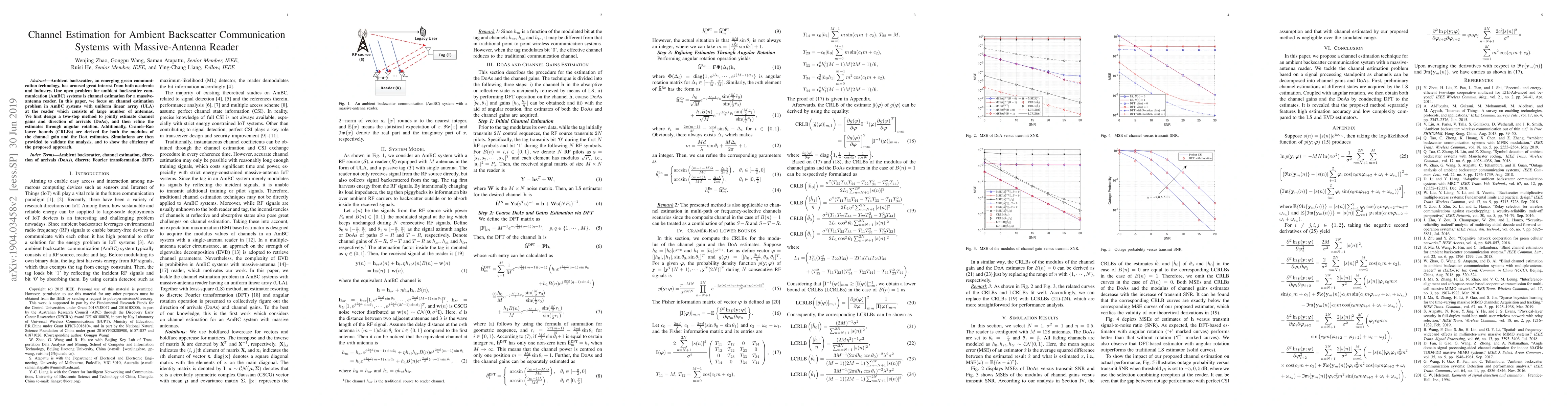 This paper proposes a two-step method for channel estimation in ambient backscatter communication systems with a massive-antenna reader using a uniform linear array. The method jointly estimates channel gains and direction of arrivals, followed by refinement through angular rotation, and provides Cramer-Rao lower bounds for the estimates. Simulation results validate the efficiency of the proposed approach.