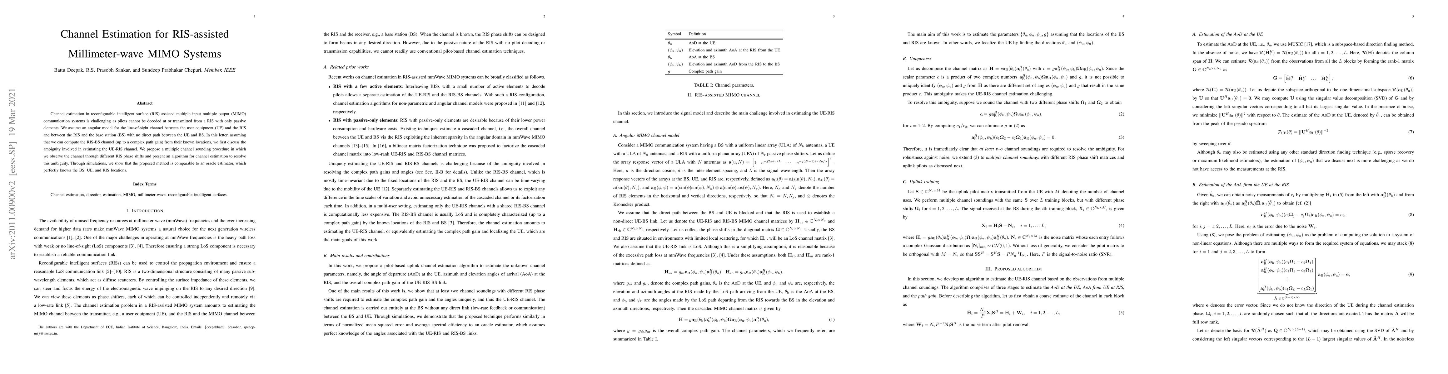 This paper addresses channel estimation in RIS-assisted millimeter-wave MIMO systems, proposing a multiple channel sounding procedure to resolve ambiguities in the UE-RIS channel. The method leverages different RIS phase shifts and demonstrates comparable performance to an ideal estimator through simulations.
