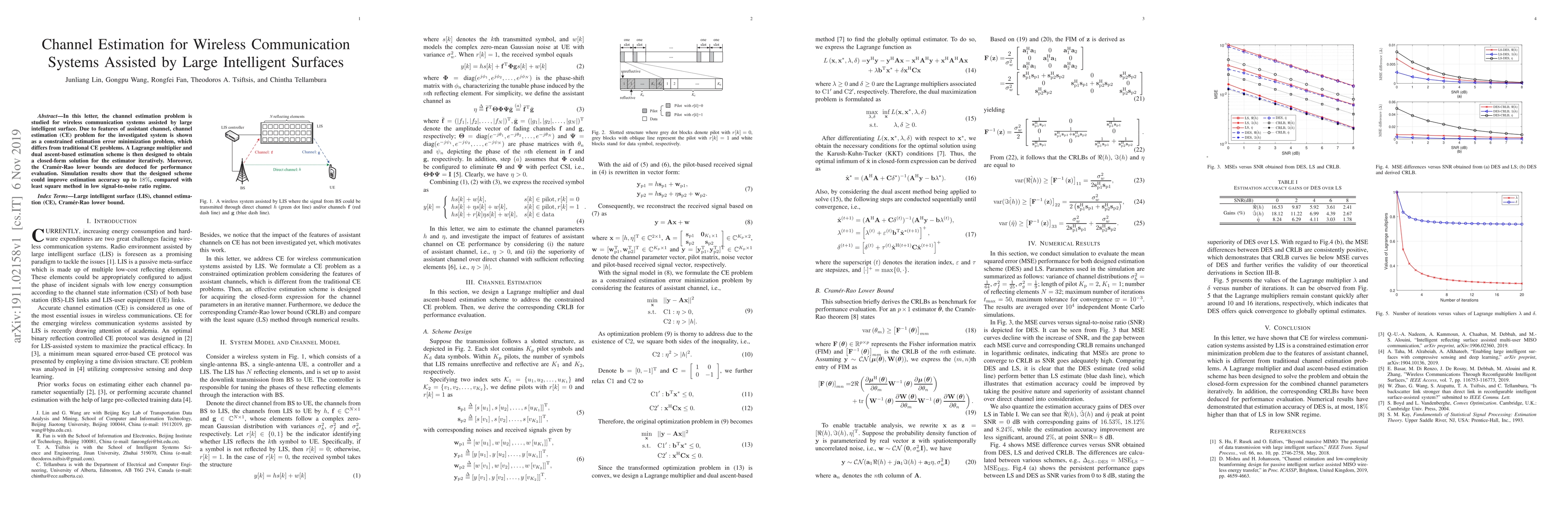 This paper proposes a novel channel estimation scheme for wireless systems aided by large intelligent surfaces, framing the problem as a constrained estimation error minimization. The method utilizes a Lagrange multiplier and dual ascent approach to iteratively derive a closed-form solution, outperforming the least square method by up to 18% in accuracy under low signal-to-noise conditions.