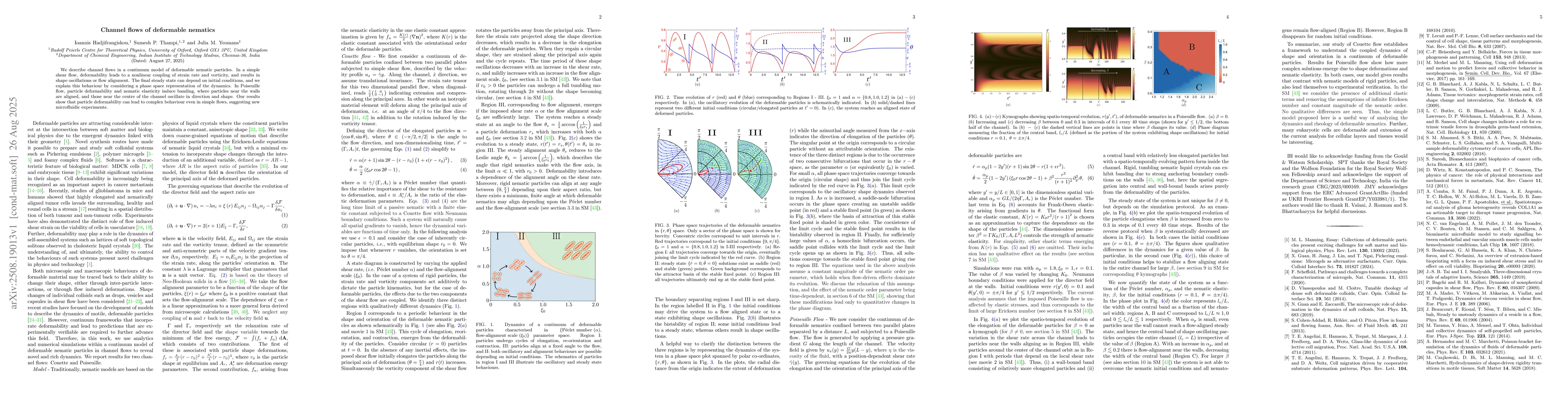 We describe channel flows in a continuum model of deformable nematic particles. In a simple shear flow, deformability leads to a nonlinear coupling of strain rate and vorticity, and results in shape oscillations or flow alignment. The final steady state can depend on initial conditions, and we explain this behaviour by considering a phase space representation of the dynamics. In Poiseuille flow, particle deformability and nematic elasticity induce banding, where particles near the walls are aligned, and those near the centre of the channel oscillate in direction and shape. Our results show that particle deformability can lead to complex behaviour even in simple flows, suggesting new microfluidic experiments.