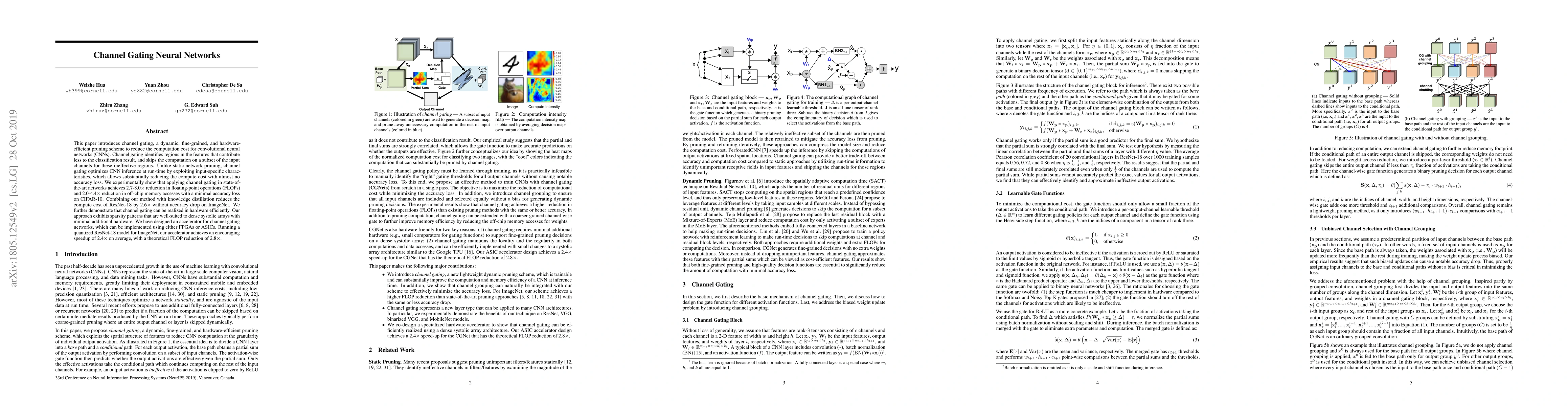 This paper introduces channel gating, a dynamic, fine-grained, and hardware-efficient pruning scheme to reduce the computation cost for convolutional neural networks (CNNs). Channel gating identifies regions in the features that contribute less to the classification result, and skips the computation on a subset of the input channels for these ineffective regions. Unlike static network pruning, channel gating optimizes CNN inference at run-time by exploiting input-specific characteristics, which allows substantially reducing the compute cost with almost no accuracy loss. We experimentally show that applying channel gating in state-of-the-art networks achieves 2.7-8.0$\times$ reduction in floating-point operations (FLOPs) and 2.0-4.4$\times$ reduction in off-chip memory accesses with a minimal accuracy loss on CIFAR-10. Combining our method with knowledge distillation reduces the compute cost of ResNet-18 by 2.6$\times$ without accuracy drop on ImageNet. We further demonstrate that channel gating can be realized in hardware efficiently. Our approach exhibits sparsity patterns that are well-suited to dense systolic arrays with minimal additional hardware. We have designed an accelerator for channel gating networks, which can be implemented using either FPGAs or ASICs. Running a quantized ResNet-18 model for ImageNet, our accelerator achieves an encouraging speedup of 2.4$\times$ on average, with a theoretical FLOP reduction of 2.8$\times$.