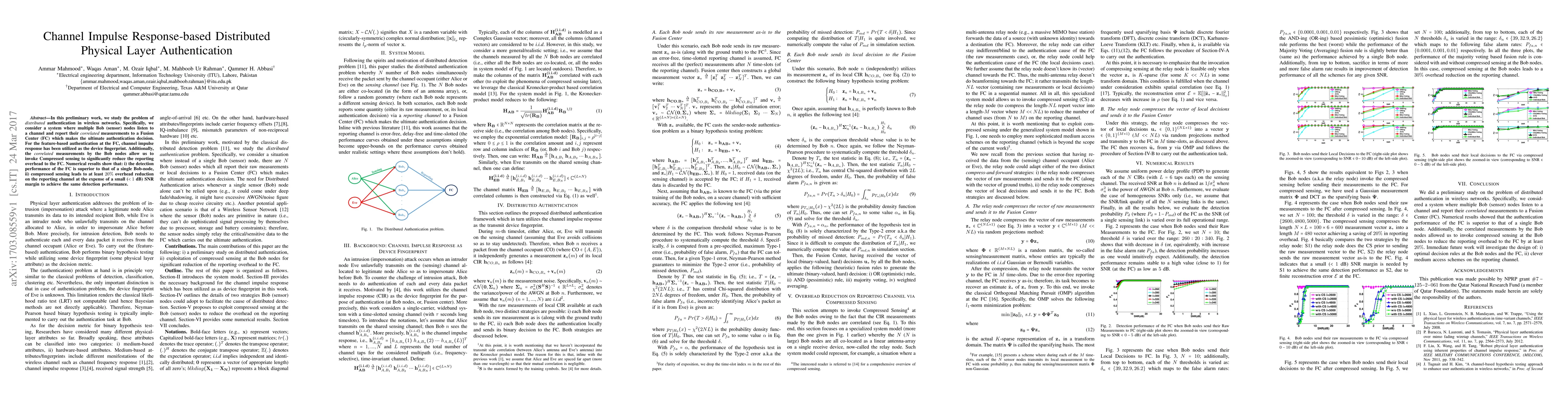 This paper proposes a distributed authentication method in wireless networks using channel impulse response as a device fingerprint. By leveraging correlated measurements from multiple sensor nodes and compressed sensing, the Fusion Center can achieve superior detection performance with a significant reduction in reporting overhead.
