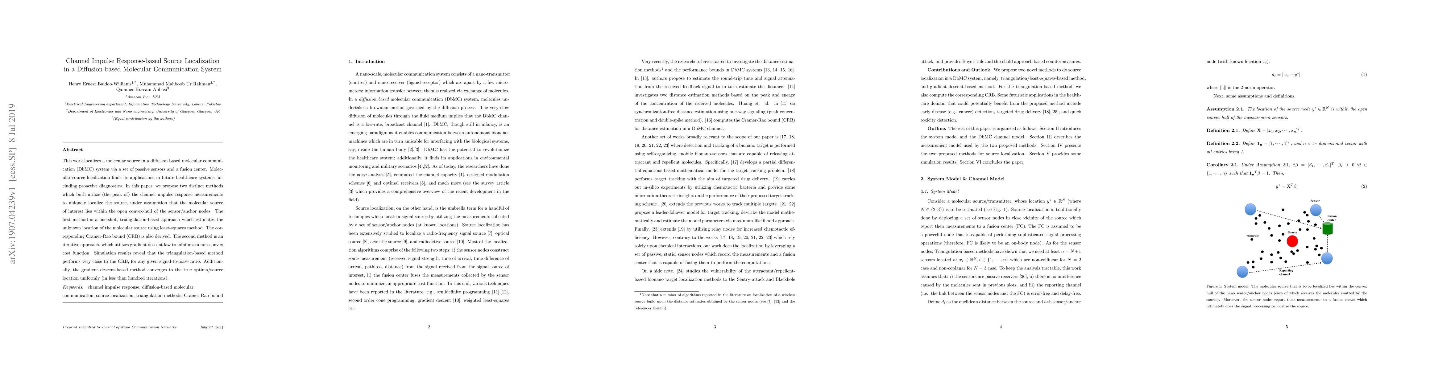 This paper proposes two methods for localizing a molecular source in a diffusion-based molecular communication system using channel impulse response measurements. The triangulation-based method estimates the source location with high accuracy, while the iterative gradient descent method converges quickly to the true source location.