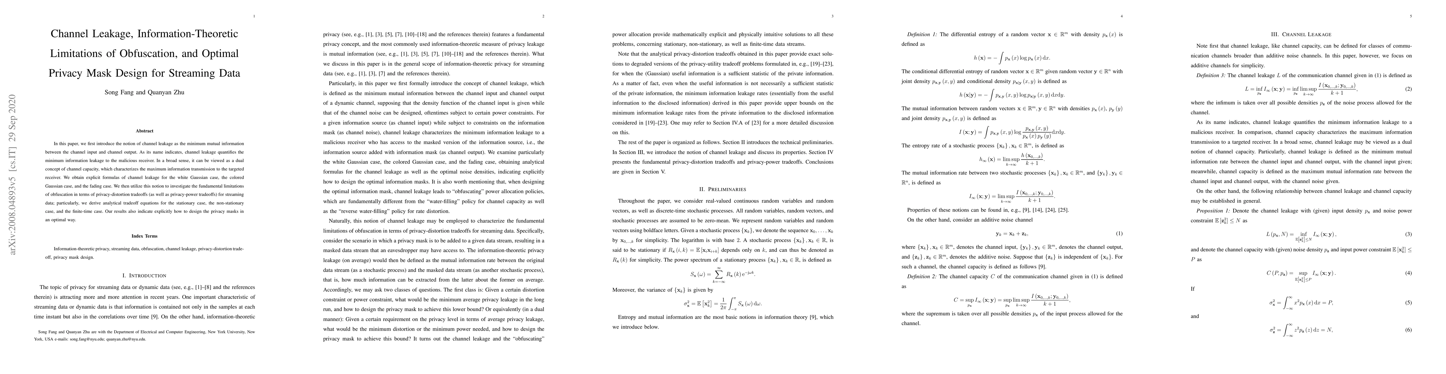 This paper introduces channel leakage to quantify minimum information leakage to a malicious receiver, contrasting it with channel capacity. It derives explicit formulas for channel leakage in various scenarios and uses this concept to analyze the fundamental limitations of obfuscation in streaming data, providing analytical tradeoffs and optimal privacy mask design.