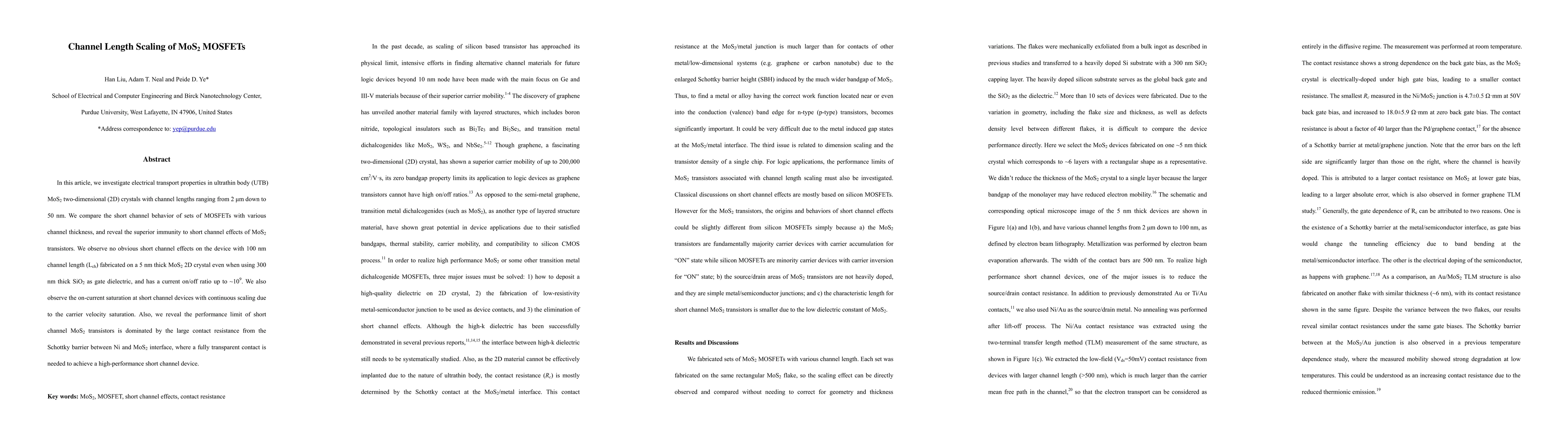 This paper investigates the electrical transport properties of MoS2 MOSFETs with channel lengths down to 50 nm, finding that MoS2 transistors exhibit superior immunity to short channel effects, with no obvious short channel effects observed at 100 nm channel lengths. The study also highlights the need for fully transparent contacts to overcome large contact resistance for optimal performance.