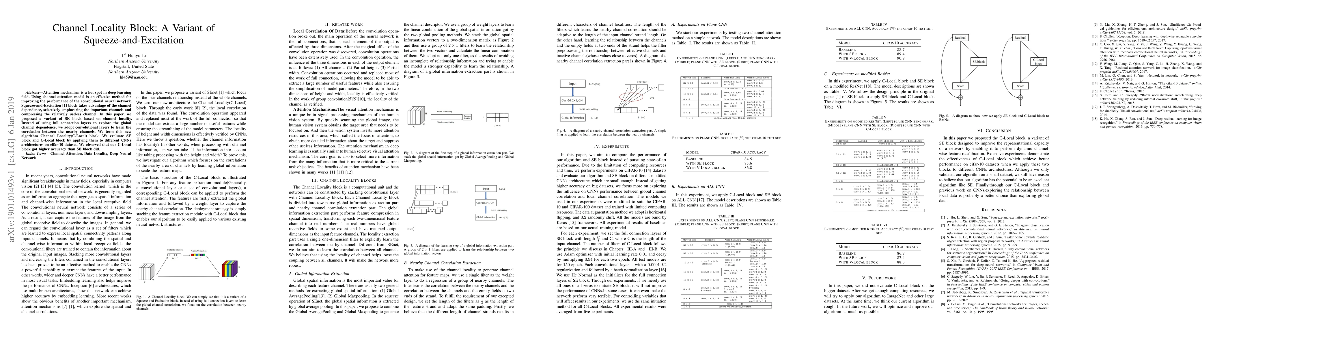 This paper proposes a Channel Locality Block (C-Local) as a variant of the Squeeze-and-Excitation block, using convolutional layers to learn local channel correlations instead of global dependencies, achieving higher accuracy on the cifar-10 dataset compared to the original SE block.