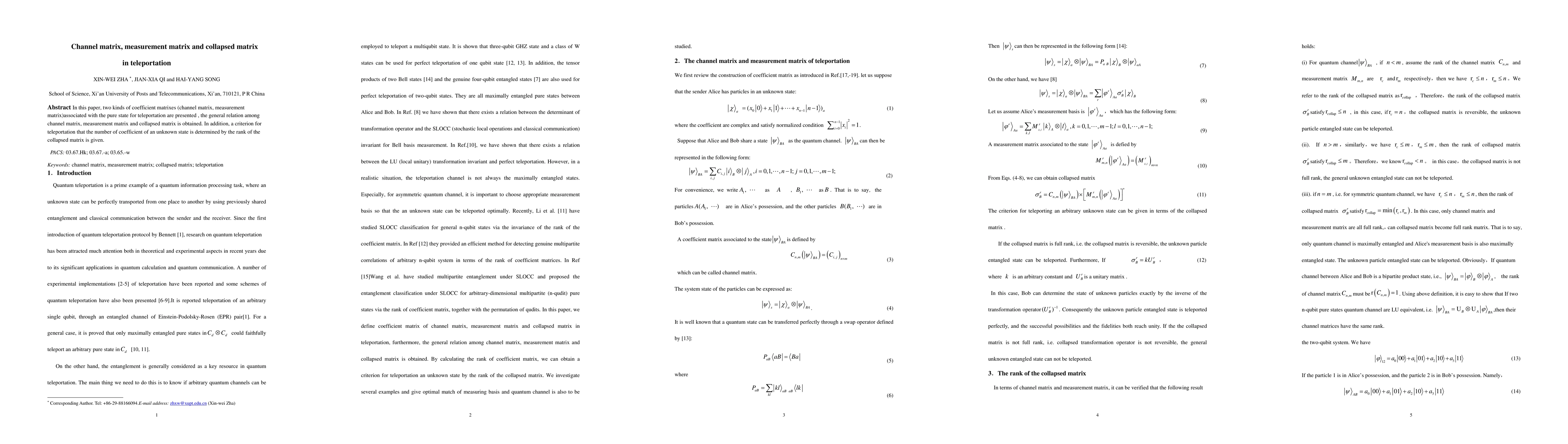 In this paper, two kinds of coefficient matrixes (channel matrix, measurement matrix)associated with the pure state for teleportation are presented, the general relation among channel matrix, measurement matrix and collapsed matrix is obtained. In addition, a criterion for teleportation that the number of coefficient of an unknown state is determined by the rank of the collapsed matrix is given.