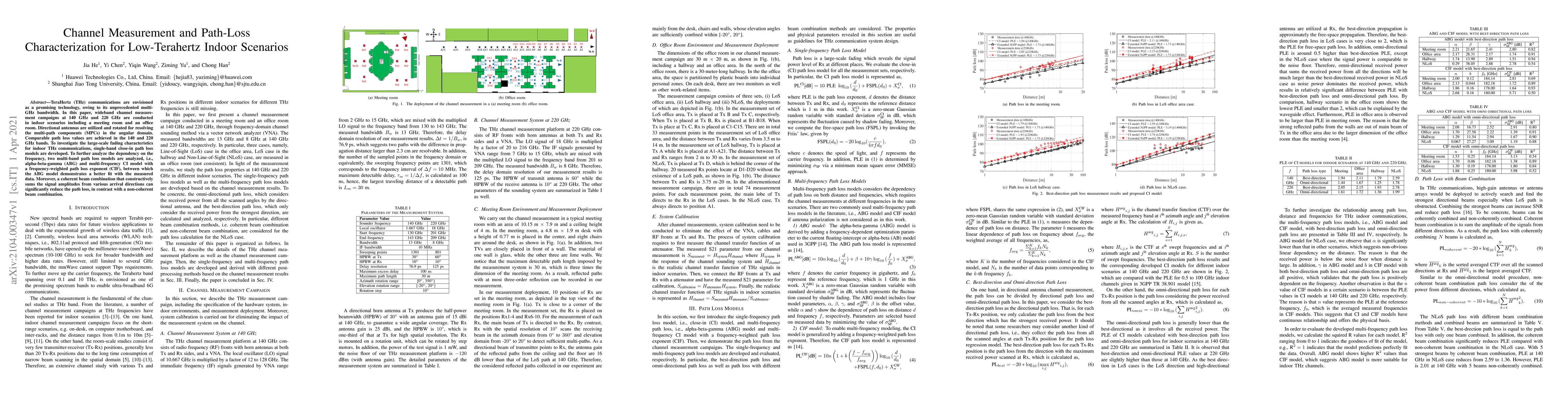 This paper conducts wideband channel measurements at 140 GHz and 220 GHz in indoor settings, developing path loss models and showing that coherent beam combination can significantly reduce path loss compared to non-coherent methods. The ABG model provides a better fit for the measured data than the CIF model.