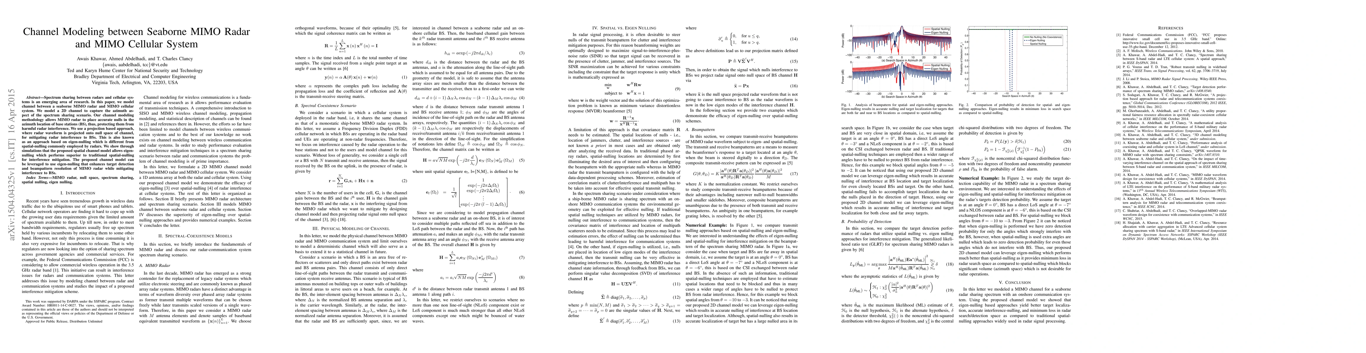 This paper models the 2D channel between a seaborne MIMO radar and MIMO cellular system to enable accurate null placement in the azimuth location of base stations, protecting them from radar interference. The proposed eigen-nulling method outperforms traditional spatial-nulling, enhancing radar target detection and beampattern resolution while mitigating interference to cellular systems.