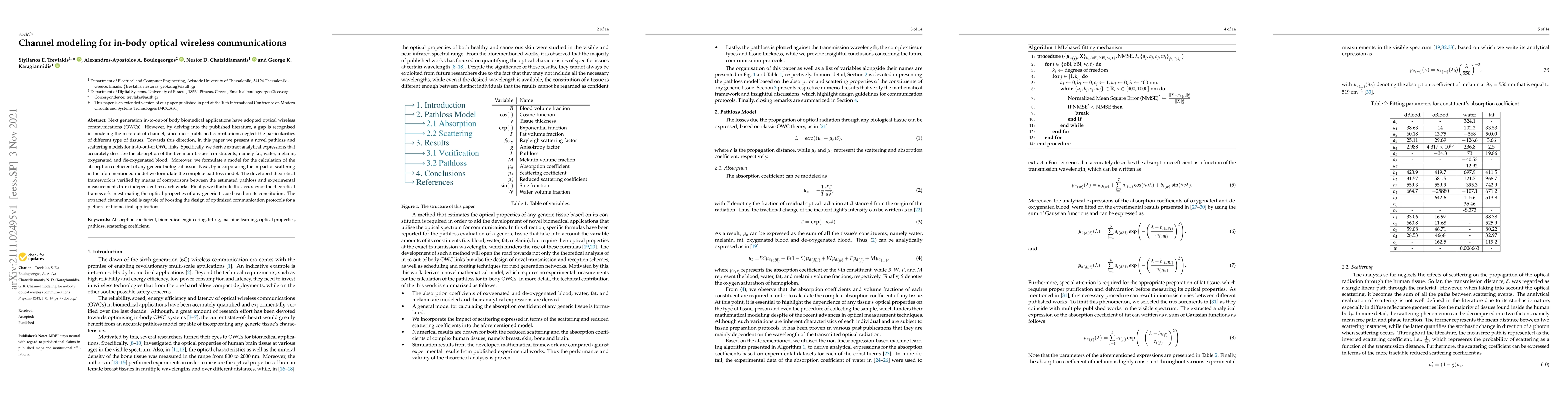 Next generation in-to-out-of body biomedical applications have adopted optical wireless communications (OWCs). However, by delving into the published literature, a gap is recognised in modeling the in-to-out-of channel, since most published contributions neglect the particularities of different type of tissues. Towards this direction, in this paper we present a novel pathloss and scattering models for in-to-out-of OWC links. Specifically, we derive extract analytical expressions that accurately describe the absorption of the five main tissues' constituents, namely fat, water, melanin, oxygenated and de-oxygenated blood. Moreover, we formulate a model for the calculation of the absorption coefficient of any generic biological tissue. Next, by incorporating the impact of scattering in the aforementioned model we formulate the complete pathloss model. The developed theoretical framework is verified by means of comparisons between the estimated pathloss and experimental measurements from independent research works. Finally, we illustrate the accuracy of the theoretical framework in estimating the optical properties of any generic tissue based on its constitution. The extracted channel model is capable of boosting the design of optimized communication protocols for a plethora of biomedical applications.