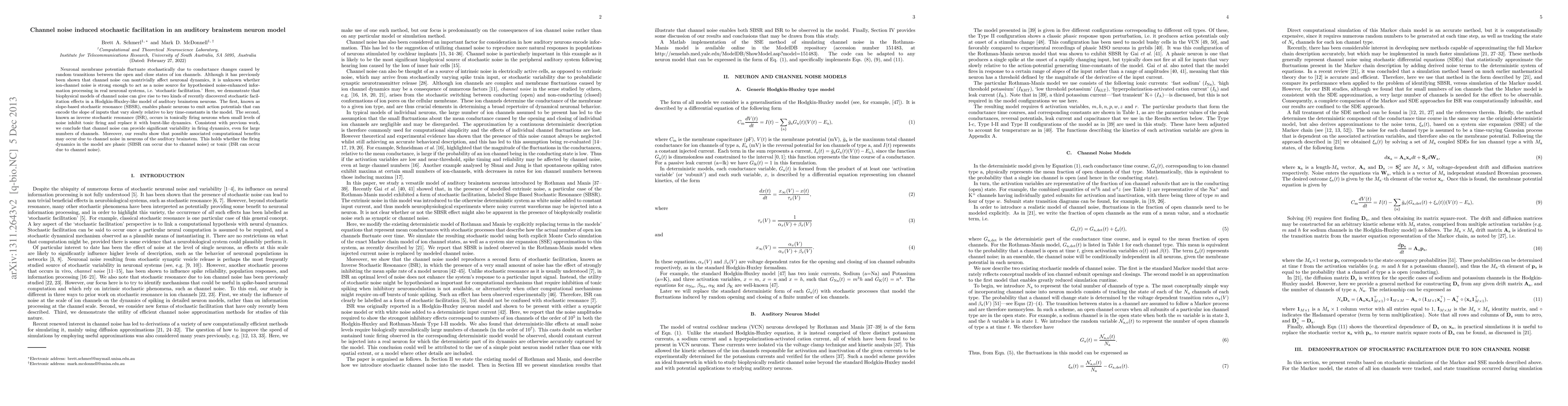 Neuronal membrane potentials fluctuate stochastically due to conductance changes caused by random transitions between the open and close states of ion channels. Although it has previously been shown that channel noise can nontrivially affect neuronal dynamics, it is unknown whether ion-channel noise is strong enough to act as a noise source for hypothesised noise-enhanced information processing in real neuronal systems, i.e. 'stochastic facilitation.' Here, we demonstrate that biophysical models of channel noise can give rise to two kinds of recently discovered stochastic facilitation effects in a Hodgkin-Huxley-like model of auditory brainstem neurons. The first, known as slope-based stochastic resonance (SBSR), enables phasic neurons to emit action potentials that can encode the slope of inputs that vary slowly relative to key time-constants in the model. The second, known as inverse stochastic resonance (ISR), occurs in tonically firing neurons when small levels of noise inhibit tonic firing and replace it with burst-like dynamics. Consistent with previous work, we conclude that channel noise can provide significant variability in firing dynamics, even for large numbers of channels. Moreover, our results show that possible associated computational benefits may occur due to channel noise in neurons of the auditory brainstem. This holds whether the firing dynamics in the model are phasic (SBSR can occur due to channel noise) or tonic (ISR can occur due to channel noise).