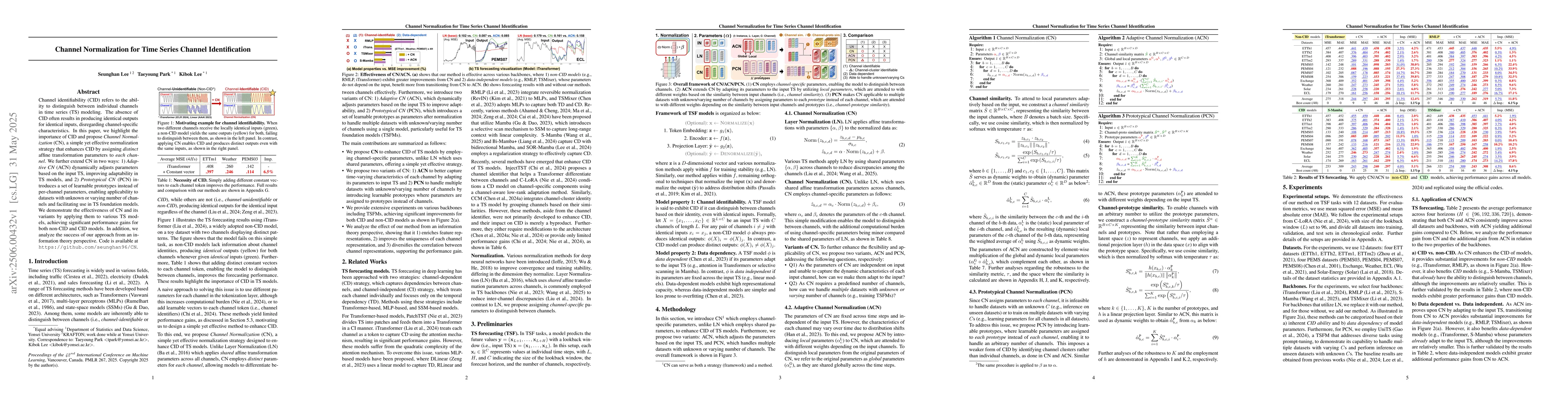 This paper introduces Channel Normalization (CN) to enhance channel identifiability in time series modeling, achieving significant performance gains for non-CID models and demonstrating its effectiveness with adaptive and prototypical variants.
