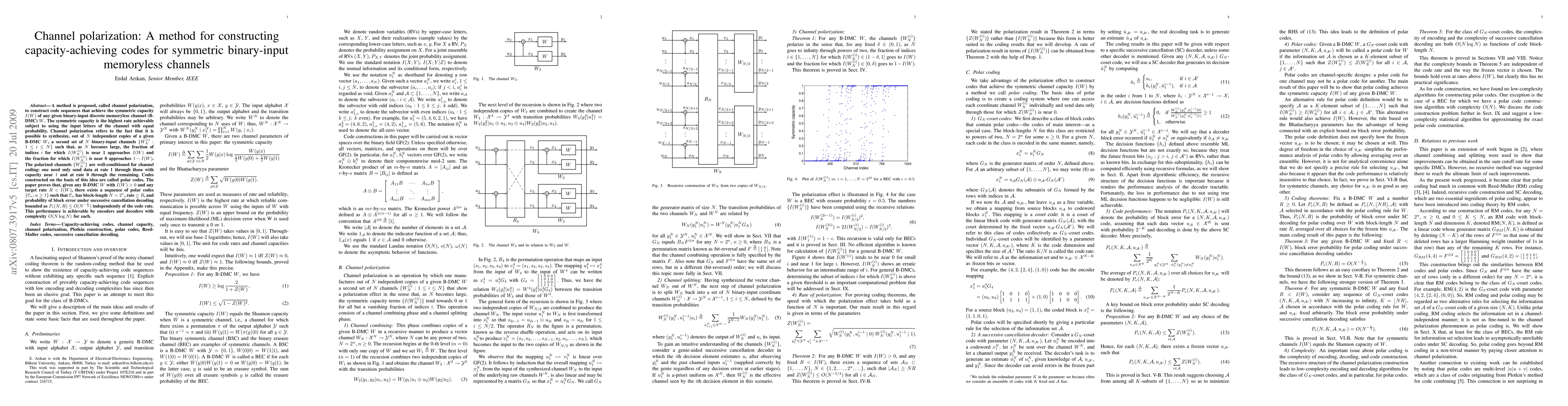 The paper introduces channel polarization, a method to construct polar codes that achieve the symmetric capacity of any binary-input discrete memoryless channel. These codes are shown to have low error rates and manageable encoding/decoding complexity, making them capacity-achieving for large channel uses.