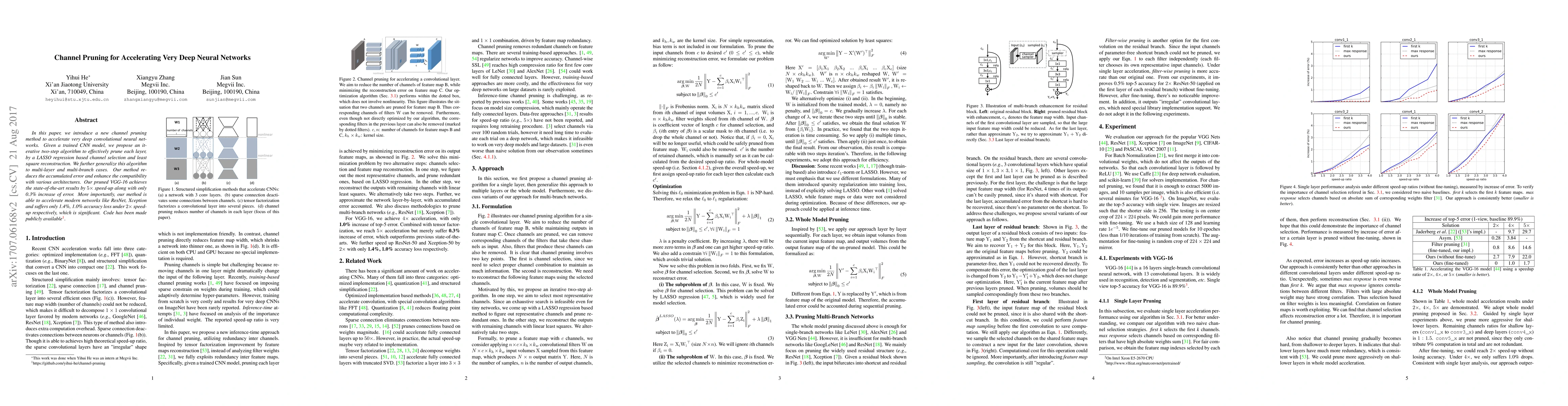 This paper presents a channel pruning technique to speed up very deep convolutional neural networks. The proposed iterative two-step algorithm, based on LASSO regression and least square reconstruction, effectively prunes channels in each layer, achieving state-of-the-art results with minimal error increase. The method is versatile and applicable to various architectures, including ResNet and Xception, with notable speed improvements and minimal loss in accuracy.