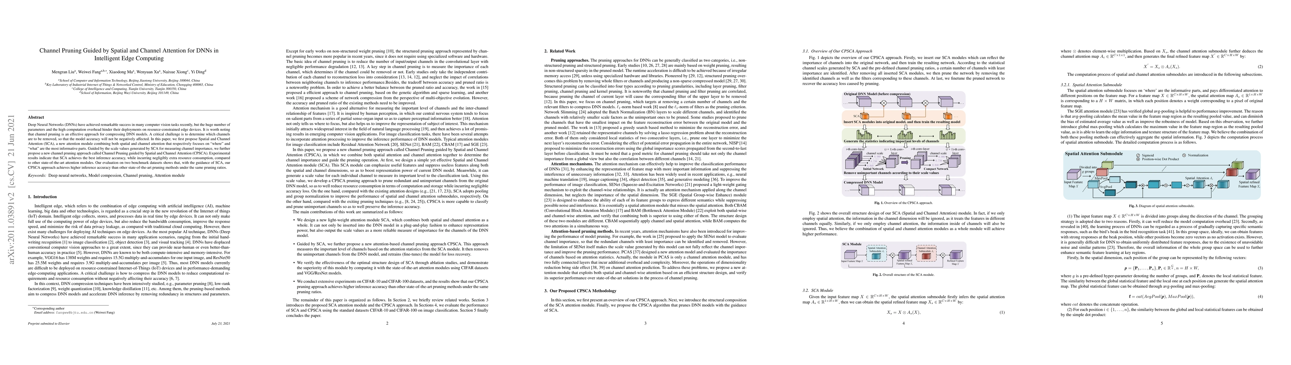 Deep Neural Networks (DNNs) have achieved remarkable success in many computer vision tasks recently, but the huge number of parameters and the high computation overhead hinder their deployments on resource-constrained edge devices. It is worth noting that channel pruning is an effective approach for compressing DNN models. A critical challenge is to determine which channels are to be removed, so that the model accuracy will not be negatively affected. In this paper, we first propose Spatial and Channel Attention (SCA), a new attention module combining both spatial and channel attention that respectively focuses on "where" and "what" are the most informative parts. Guided by the scale values generated by SCA for measuring channel importance, we further propose a new channel pruning approach called Channel Pruning guided by Spatial and Channel Attention (CPSCA). Experimental results indicate that SCA achieves the best inference accuracy, while incurring negligibly extra resource consumption, compared to other state-of-the-art attention modules. Our evaluation on two benchmark datasets shows that, with the guidance of SCA, our CPSCA approach achieves higher inference accuracy than other state-of-the-art pruning methods under the same pruning ratios.