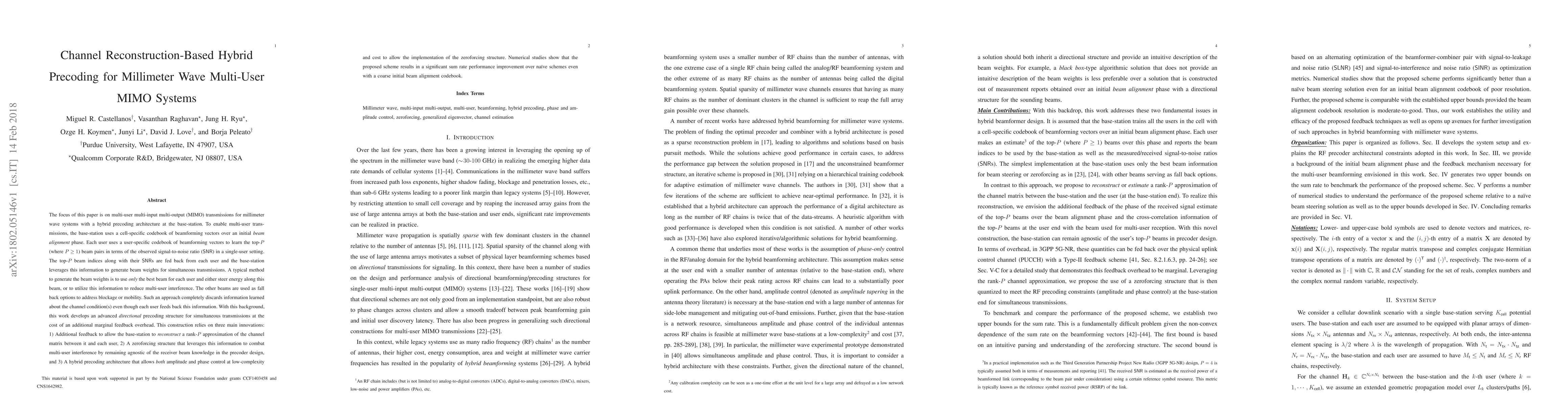 This paper proposes a hybrid precoding architecture for multi-user MIMO transmissions in millimeter wave systems, utilizing additional channel feedback to reconstruct a rank-P channel matrix approximation. The approach leverages a zeroforcing structure to mitigate multi-user interference and achieves significant sum rate improvements over traditional methods.