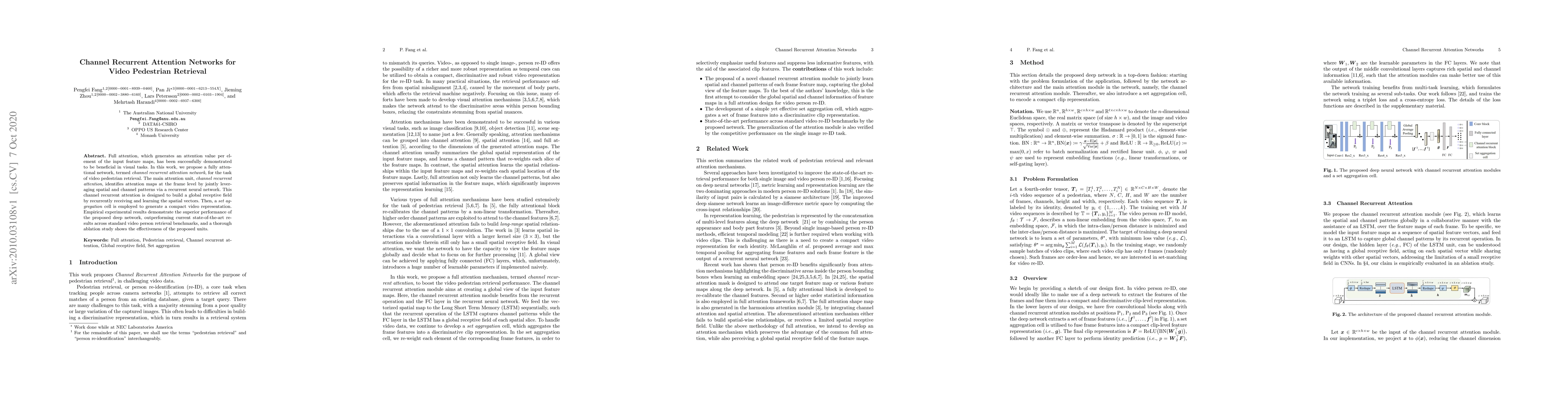 This paper proposes a channel recurrent attention network for video pedestrian retrieval, utilizing a recurrent attention unit to identify frame-level attention maps by integrating spatial and channel patterns. The network's set aggregation cell generates a compact video representation, achieving superior performance over current state-of-the-art methods on standard benchmarks.