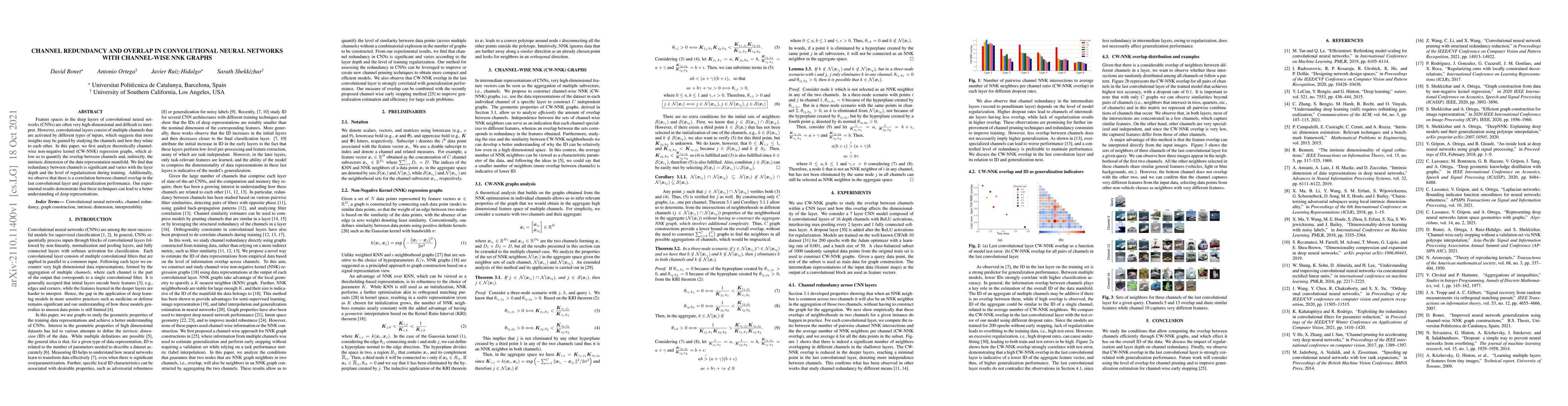 Feature spaces in the deep layers of convolutional neural networks (CNNs) are often very high-dimensional and difficult to interpret. However, convolutional layers consist of multiple channels that are activated by different types of inputs, which suggests that more insights may be gained by studying the channels and how they relate to each other. In this paper, we first analyze theoretically channel-wise non-negative kernel (CW-NNK) regression graphs, which allow us to quantify the overlap between channels and, indirectly, the intrinsic dimension of the data representation manifold. We find that redundancy between channels is significant and varies with the layer depth and the level of regularization during training. Additionally, we observe that there is a correlation between channel overlap in the last convolutional layer and generalization performance. Our experimental results demonstrate that these techniques can lead to a better understanding of deep representations.