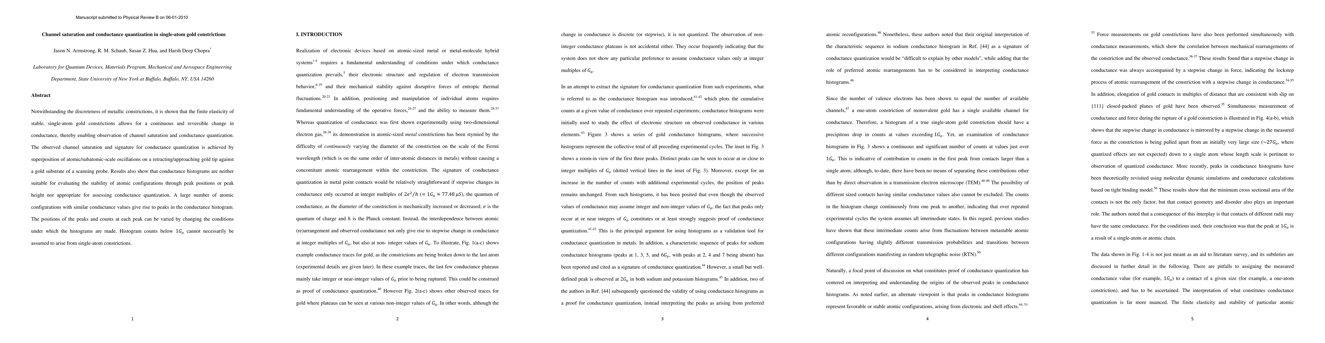 This study reveals that the elasticity of single-atom gold constrictions allows for continuous conductance changes, enabling observation of channel saturation and conductance quantization. However, conductance histograms are not reliable for assessing atomic configuration stability or conductance quantization due to variability in peak positions and counts.