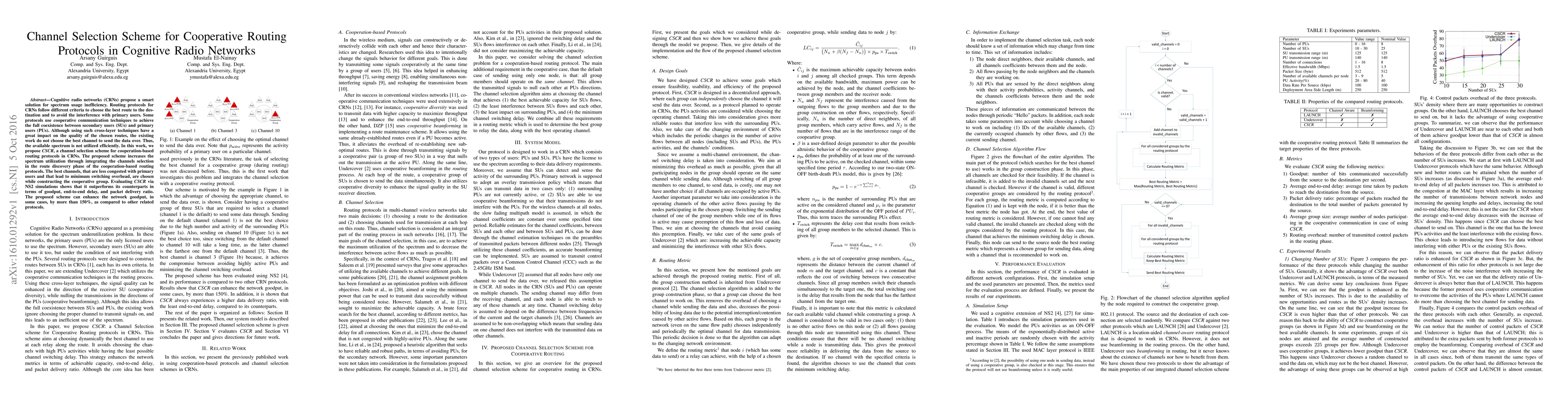 This paper proposes CSCR, a channel selection scheme for cooperative routing protocols in cognitive radio networks, aiming to enhance spectrum utilization by selecting optimal channels during the route discovery phase. Simulation results show CSCR significantly improves goodput, reduces delay, and increases packet delivery ratio compared to existing protocols.