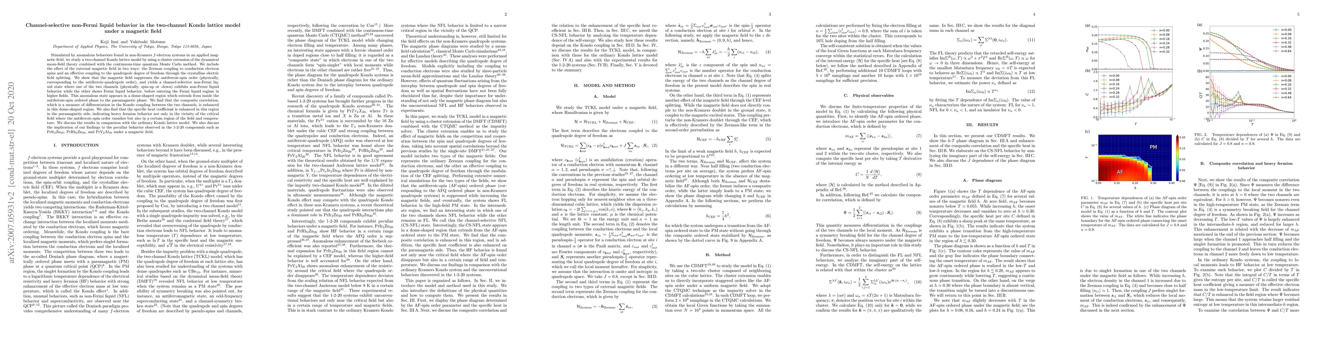 Stimulated by anomalous behaviors found in non-Kramers $f$-electron systems in an applied magnetic field, we study a two-channel Kondo lattice model by using a cluster extension of the dynamical mean-field theory combined with the continuous-time quantum Monte Carlo method. We include the effect of the external magnetic field in two ways: the Zeeman coupling to conduction electron spins and an effective coupling to the quadrupole degree of freedom through the crystalline electric field splitting. We show that the magnetic field suppresses the antiferroic-spin order (physically, corresponding to the antiferroic-quadrupole order), and yields a channel-selective non-Fermi liquid state where one of the two channels (physically, spin-up or -down) exhibits non-Fermi liquid behavior while the other shows Fermi liquid behavior, before entering the Fermi liquid regime in higher fields. This anomalous state appears in a dome-shaped region which extends from inside the antiferroic-spin ordered phase to the paramagnetic phase. We find that the composite correlation, which is a measure of differentiation in the Kondo coupling between the two channels, is enhanced in this dome-shaped region. We also find that the specific heat coefficient is enhanced in this region in the paramagnetic side, indicating heavy fermion behavior not only in the vicinity of the critical field where the antiferroic-spin order vanishes but also in a certain region of the field and temperature. We discuss the results in comparison with the ordinary Kondo lattice model. We also discuss the implication of our findings to the peculiar behavior observed in the 1-2-20 compounds such as $\rm{PrIr_2Zn_{20}}$, $\rm{PrRh_2Zn_{20}}$, and $\rm{PrV_2Al_{20}}$ under a magnetic field.