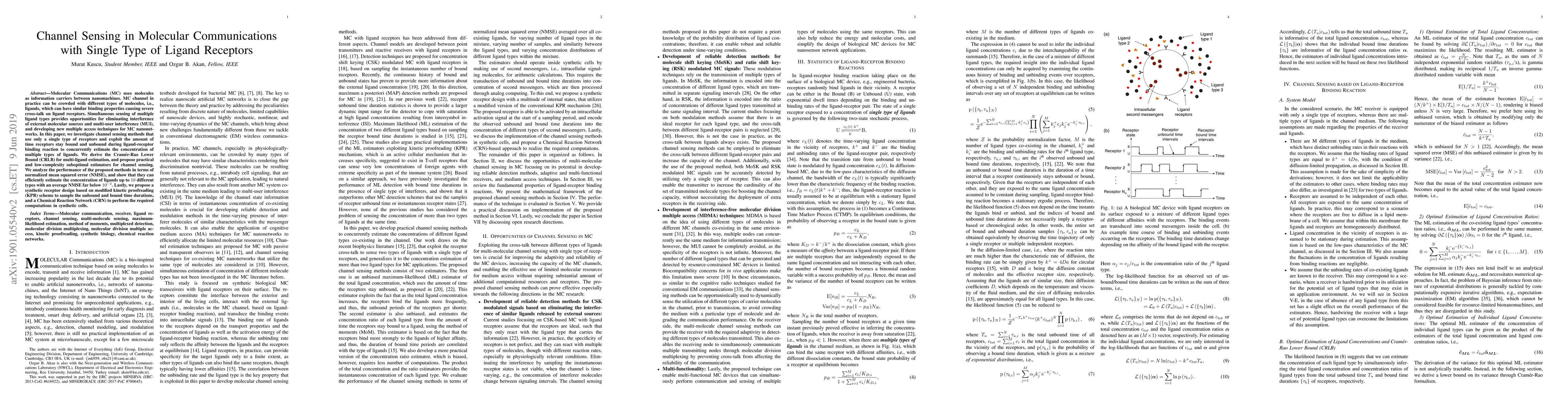 Molecular Communications (MC) uses molecules as information carriers between nanomachines. MC channel in practice can be crowded with different types of molecules, i.e., ligands, which can have similar binding properties causing severe cross-talk on ligand receptors. Simultaneous sensing of multiple ligand types provides opportunities for eliminating interference of external molecular sources and multi-user interference (MUI), and developing new multiple access techniques for MC nanonetworks. In this paper, we investigate channel sensing methods that use only a single type of receptors and exploit the amount of time receptors stay bound and unbound during ligand-receptor binding reaction to concurrently estimate the concentration of multiple types of ligands. We derive the Cram\'er-Rao Lower Bound (CRLB) for multi-ligand estimation, and propose practical and low-complexity suboptimal estimators for channel sensing. We analyze the performance of the proposed methods in terms of normalized mean squared error (NMSE), and show that they can efficiently estimate the concentration of ligands up to $10$ different types with an average NMSE far below $10^{-2}$. Lastly, we propose a synthetic receptor design based on modified kinetic proofreading (KPR) scheme to sample the unbound and bound time durations, and a Chemical Reaction Network (CRN) to perform the required computations in synthetic cells.
