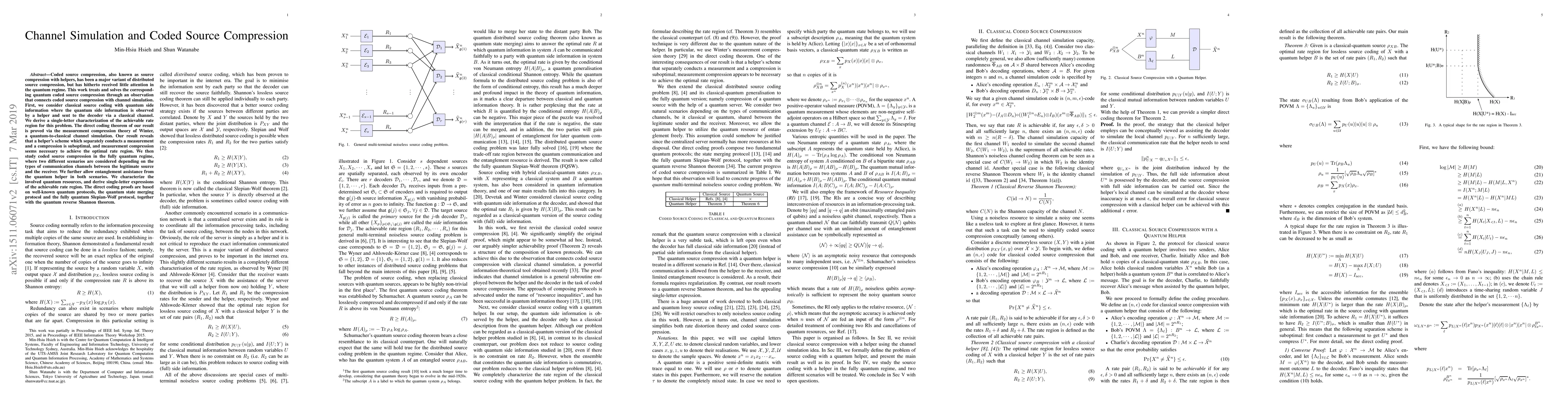 Coded source compression, also known as source compression with helpers, has been a major variant of distributed source compression, but has hitherto received little attention in the quantum regime. This work treats and solves the corresponding quantum coded source compression through an observation that connects coded source compression with channel simulation. First, we consider classical source coding with quantum side information where the quantum side information is observed by a helper and sent to the decoder via a classical channel. We derive a single-letter characterization of the achievable rate region for this problem. The direct coding theorem of our result is proved via the measurement compression theory of Winter, a quantum-to-classical channel simulation. Our result reveals that a helper's scheme which separately conducts a measurement and a compression is suboptimal, and measurement compression seems necessary to achieve the optimal rate region. We then study coded source compression in the fully quantum regime, where two different scenarios are considered depending on the types of communication channels between the legitimate source and the receiver. We further allow entanglement assistance from the quantum helper in both scenarios. We characterize the involved quantum resources, and derive single-letter expressions of the achievable rate region. The direct coding proofs are based on well-known quantum protocols, the quantum state merging protocol and the fully quantum Slepian-Wolf protocol, together with the quantum reverse Shannon theorem.