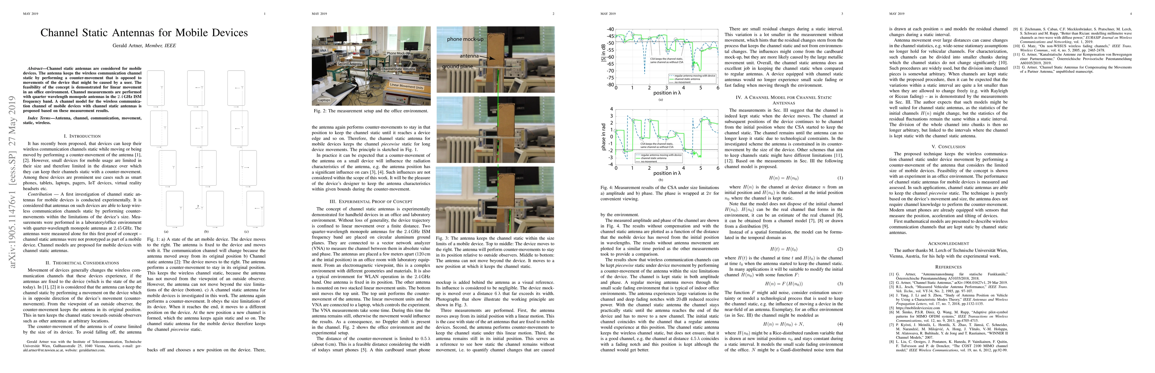 Channel static antennas are considered for mobile devices. The antenna keeps the wireless communication channel static by performing a counter-movement that is opposed to movements of the device that might be caused by a user. The feasibility of the concept is demonstrated for linear movement in an office environment. Channel measurements are performed with quarter wavelength monopole antennas in the 2.4GHz ISM frequency band. A channel model for the wireless communication channel of mobile devices with channel static antennas is proposed based on these measurement results.