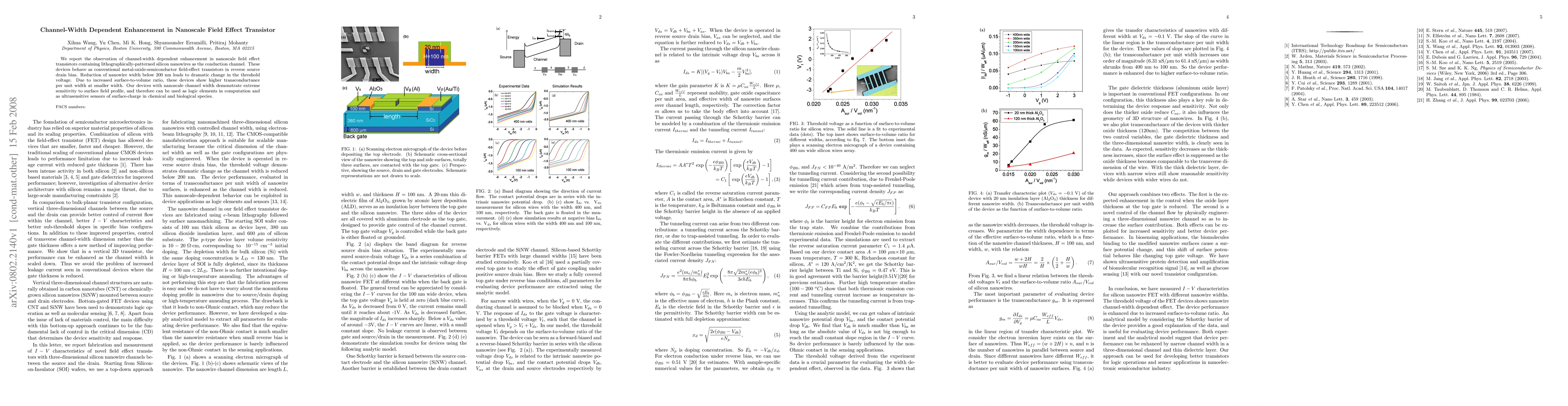 This paper reports on nanoscale field effect transistors with silicon nanowires that exhibit significant channel-width dependent enhancement, showing higher transconductance at smaller widths. These devices demonstrate extreme sensitivity to surface field profiles, making them useful for logic elements and ultrasensitive sensors.