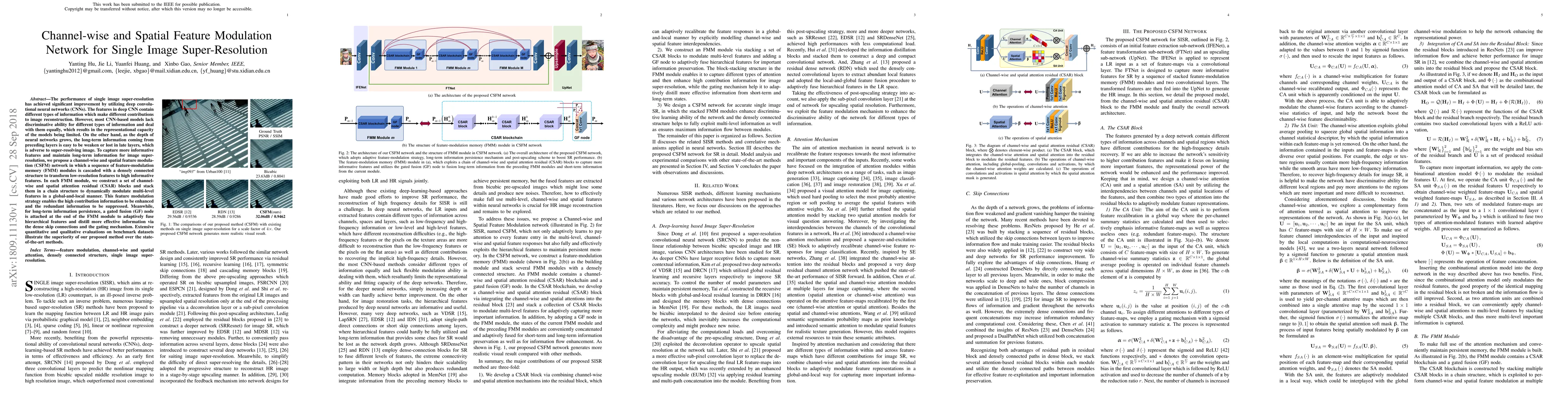The paper proposes a Channel-wise and Spatial Feature Modulation (CSFM) network for single image super-resolution, utilizing feature-modulation memory modules with channel-wise and spatial attention residual blocks to enhance informative features and suppress redundant information. The gated fusion node aids in preserving long-term information, achieving superior performance over existing methods.
