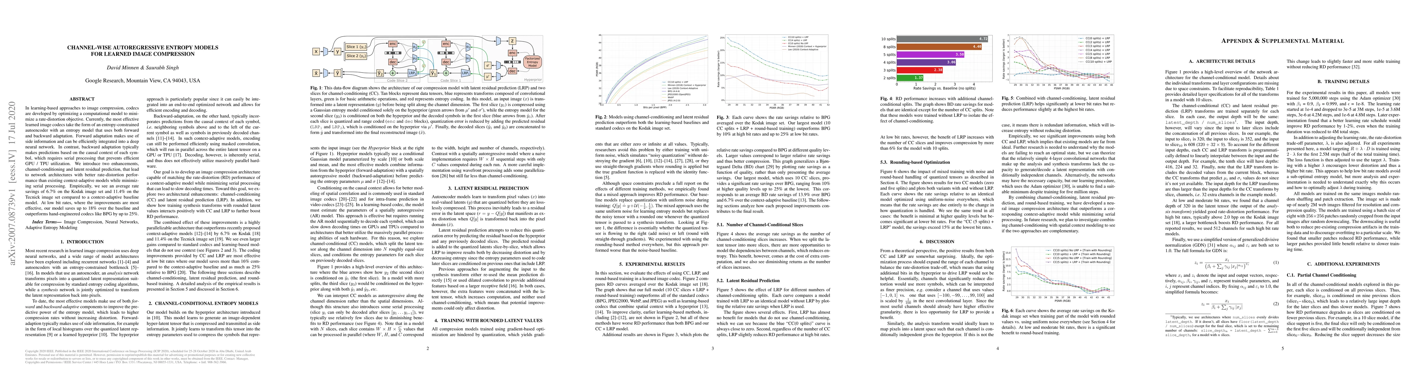 This paper proposes channel-wise autoregressive entropy models for learned image compression, introducing channel-conditioning and latent residual prediction to enhance rate-distortion performance. The new model achieves significant rate savings, up to 18% over baselines at low bit rates, and outperforms hand-engineered codecs like BPG by up to 25%.