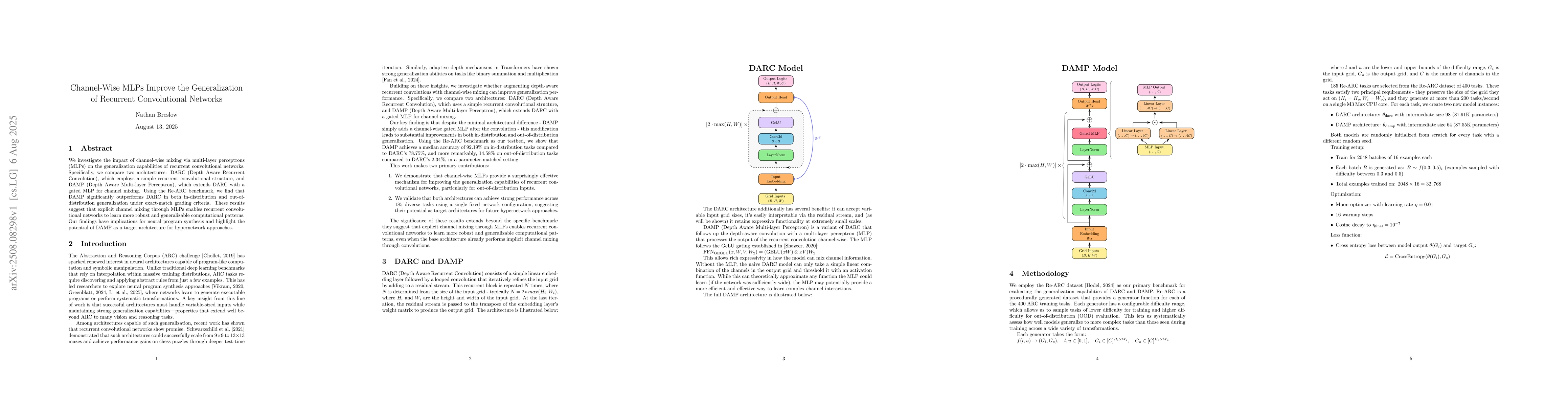 We investigate the impact of channel-wise mixing via multi-layer perceptrons (MLPs) on the generalization capabilities of recurrent convolutional networks. Specifically, we compare two architectures: DARC (Depth Aware Recurrent Convolution), which employs a simple recurrent convolutional structure, and DAMP (Depth Aware Multi-layer Perceptron), which extends DARC with a gated MLP for channel mixing. Using the Re-ARC benchmark, we find that DAMP significantly outperforms DARC in both in-distribution and out-of-distribution generalization under exact-match grading criteria. These results suggest that explicit channel mixing through MLPs enables recurrent convolutional networks to learn more robust and generalizable computational patterns. Our findings have implications for neural program synthesis and highlight the potential of DAMP as a target architecture for hypernetwork approaches.