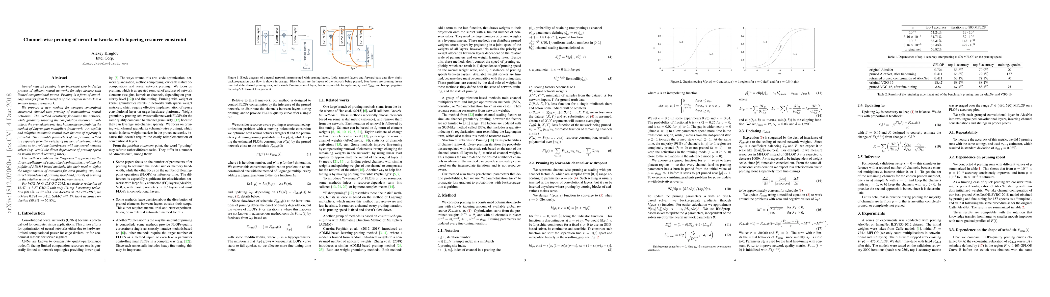 Neural network pruning is an important step in design process of efficient neural networks for edge devices with limited computational power. Pruning is a form of knowledge transfer from the weights of the original network to a smaller target subnetwork. We propose a new method for compute-constrained structured channel-wise pruning of convolutional neural networks. The method iteratively fine-tunes the network, while gradually tapering the computation resources available to the pruned network via a holonomic constraint in the method of Lagrangian multipliers framework. An explicit and adaptive automatic control over the rate of tapering is provided. The trainable parameters of our pruning method are separate from the weights of the neural network, which allows us to avoid the interference with the neural network solver (e.g. avoid the direct dependence of pruning speed on neural network learning rates). Our method combines the `rigoristic' approach by the direct application of constrained optimization, avoiding the pitfalls of ADMM-based methods, like their need to define the target amount of resources for each pruning run, and direct dependence of pruning speed and priority of pruning on the relative scale of weights between layers. For VGG-16 @ ILSVRC-2012, we achieve reduction of 15.47 -> 3.87 GMAC with only 1% top-1 accuracy reduction (68.4% -> 67.4%). For AlexNet @ ILSVRC-2012, we achieve 0.724 -> 0.411 GMAC with 1% top-1 accuracy reduction (56.8% -> 55.8%).