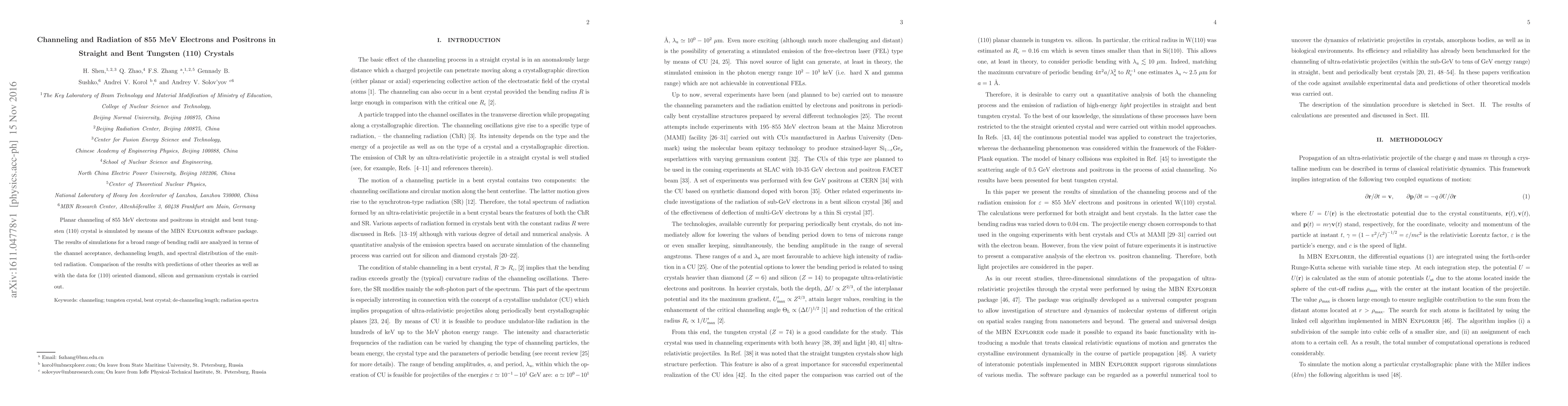This study simulates the planar channeling of 855 MeV electrons and positrons in straight and bent tungsten (110) crystals using the \MBNExplorer software, analyzing channel acceptance, dechanneling length, and emitted radiation. Comparisons are made with theoretical predictions and data from other similar crystals.