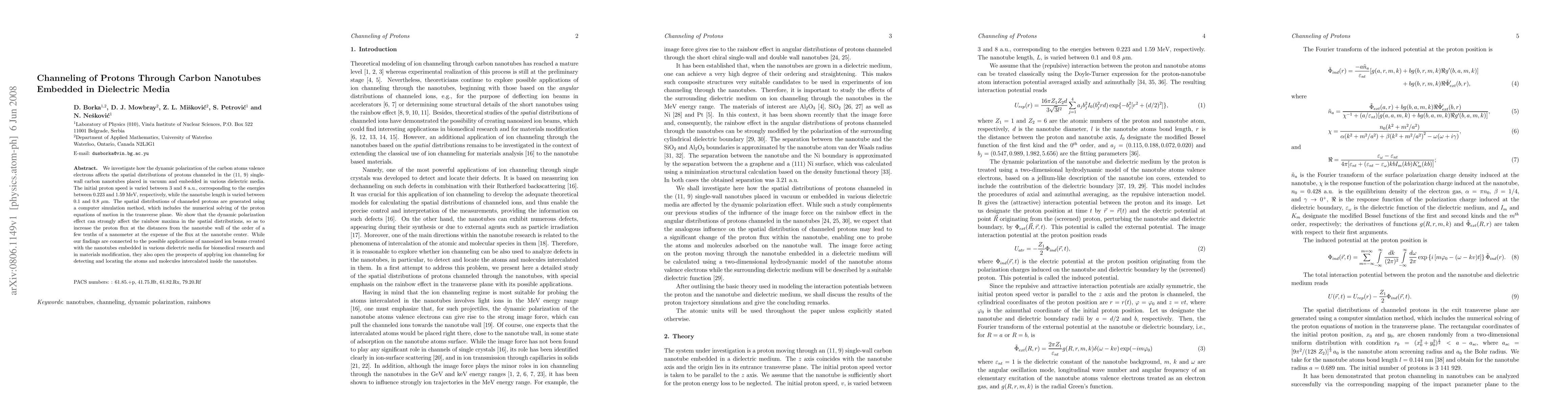 We investigate how the dynamic polarization of the carbon atoms valence electrons affects the spatial distributions of protons channeled in the (11, 9) single-wall carbon nanotubes placed in vacuum and embedded in various dielectric media. The initial proton speed is varied between 3 and 8 a.u., corresponding to the energies between 0.223 and 1.59 MeV, respectively, while the nanotube length is varied between 0.1 and 0.8 $\mu$m. The spatial distributions of channeled protons are generated using a computer simulation method, which includes the numerical solving of the proton equations of motion in the transverse plane. We show that the dynamic polarization effect can strongly affect the rainbow maxima in the spatial distributions, so as to increase the proton flux at the distances from the nanotube wall of the order of a few tenths of a nanometer at the expense of the flux at the nanotube center. While our findings are connected to the possible applications of nanosized ion beams created with the nanotubes embedded in various dielectric media for biomedical research and in materials modification, they also open the prospects of applying ion channeling for detecting and locating the atoms and molecules intercalated inside the nanotubes.