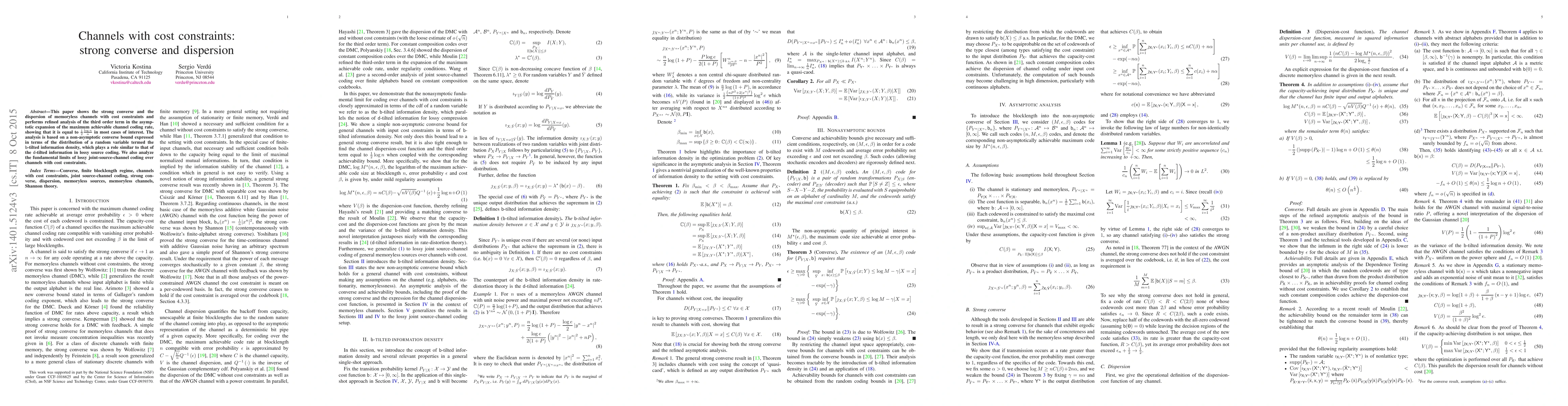 This paper shows the strong converse and the dispersion of memoryless channels with cost constraints and performs refined analysis of the third order term in the asymptotic expansion of the maximum achievable channel coding rate, showing that it is equal to $\frac 1 2 \frac {\log n}{n}$ in most cases of interest. The analysis is based on a non-asymptotic converse bound expressed in terms of the distribution of a random variable termed the $\mathsf b$-tilted information density, which plays a role similar to that of the $\mathsf d$-tilted information in lossy source coding. We also analyze the fundamental limits of lossy joint-source-channel coding over channels with cost constraints.