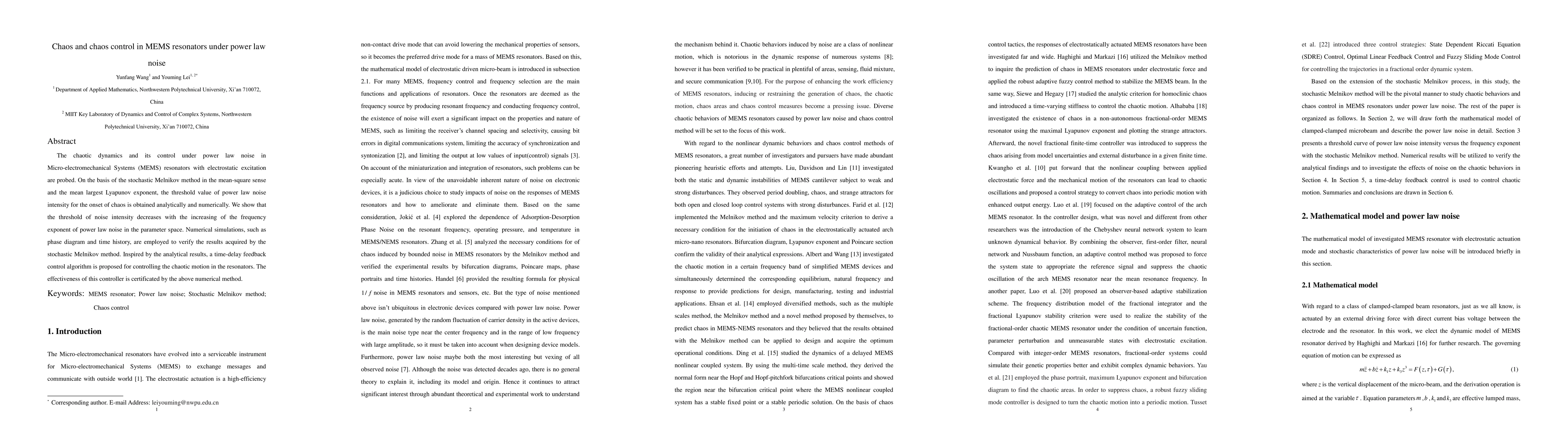 This paper investigates chaotic dynamics and control in MEMS resonators under power law noise, determining the threshold for chaos onset analytically and numerically. A time-delay feedback control algorithm is proposed and verified effective in controlling chaotic motion in these resonators.