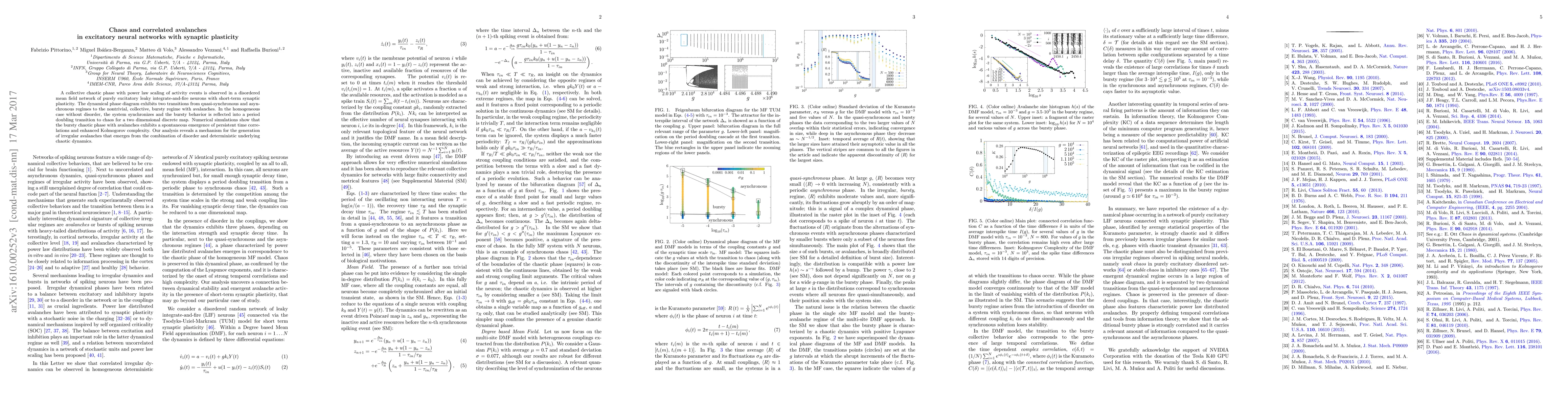 A collective chaotic phase with power law scaling of activity events is observed in a disordered mean field network of purely excitatory leaky integrate-and-fire neurons with short-term synaptic plasticity. The dynamical phase diagram exhibits two transitions from quasi-synchronous and asynchronous regimes to the nontrivial, collective, bursty regime with avalanches. In the homogeneous case without disorder, the system synchronizes and the bursty behavior is reflected into a doubling-period transition to chaos for a two dimensional discrete map. Numerical simulations show that the bursty chaotic phase with avalanches exhibits a spontaneous emergence of time correlations and enhanced Kolmogorov complexity. Our analysis reveals a mechanism for the generation of irregular avalanches that emerges from the combination of disorder and deterministic underlying chaotic dynamics.