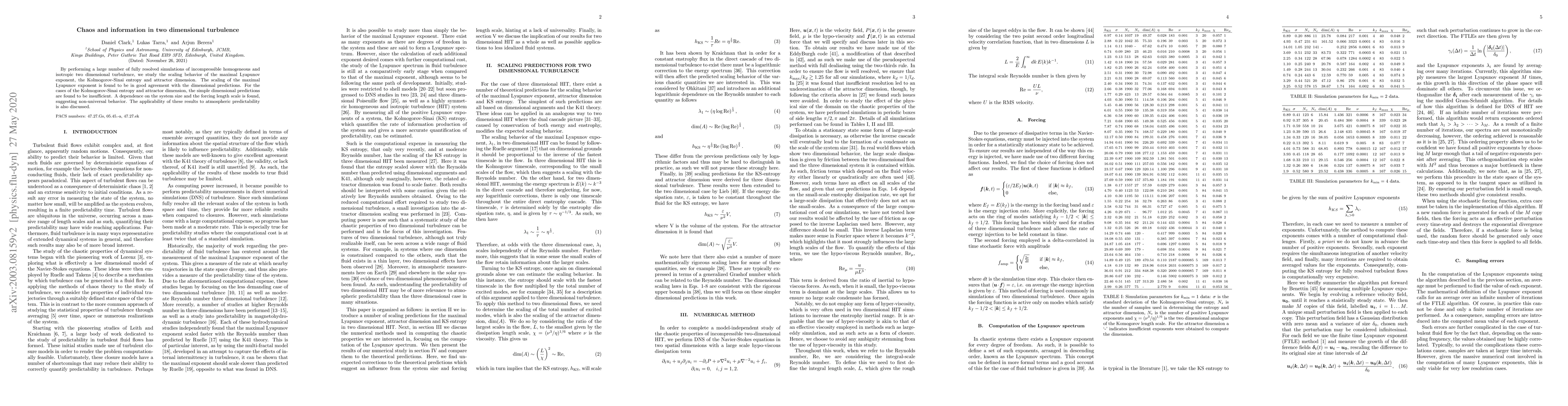 By performing a large number of fully resolved simulations of incompressible homogeneous and isotropic two dimensional turbulence, we study the scaling behavior of the maximal Lyapunov exponent, the Kolmogorov-Sinai entropy and attractor dimension. The scaling of the maximal Lyapunov exponent is found to be in good agreement with the dimensional predictions. For the cases of the Kolmogorov-Sinai entropy and attractor dimension the simple dimensional predictions are found to be insufficient. A dependence on the system size and the forcing length scale is found, suggesting non-universal behavior. The applicability of these results to atmospheric predictability is also discussed.
