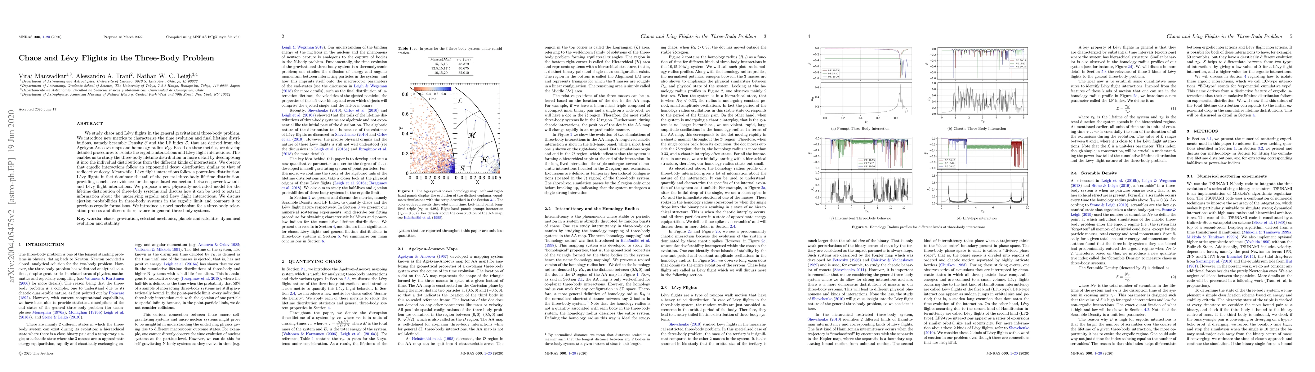 This paper introduces new metrics to analyze chaos and Lévy flights in the three-body gravitational problem, revealing that ergodic interactions follow an exponential decay while Lévy flights exhibit a power-law distribution, dominating the tail of the three-body lifetime distribution. The study proposes a new model for the lifetime distribution and discusses mass ejection probabilities and a novel relaxation mechanism.