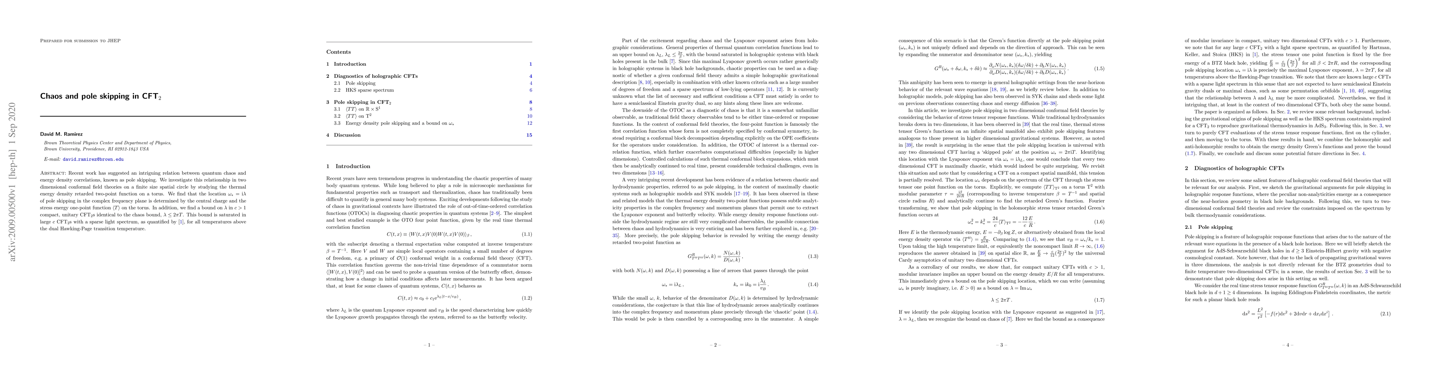 Recent work has suggested an intriguing relation between quantum chaos and energy density correlations, known as pole skipping. We investigate this relationship in two dimensional conformal field theories on a finite size spatial circle by studying the thermal energy density retarded two-point function on a torus. We find that the location $\omega_* = i \lambda$ of pole skipping in the complex frequency plane is determined by the central charge and the stress energy one-point function $\langle T\rangle$ on the torus. In addition, we find a bound on $\lambda$ in $c>1$ compact, unitary CFT$_2$s identical to the chaos bound, $\lambda \leq 2\pi T$. This bound is saturated in large $c$ CFT$_2$s with a sparse light spectrum, as quantified by arXiv:1405.5137, for all temperatures above the dual Hawking-Page transition temperature.