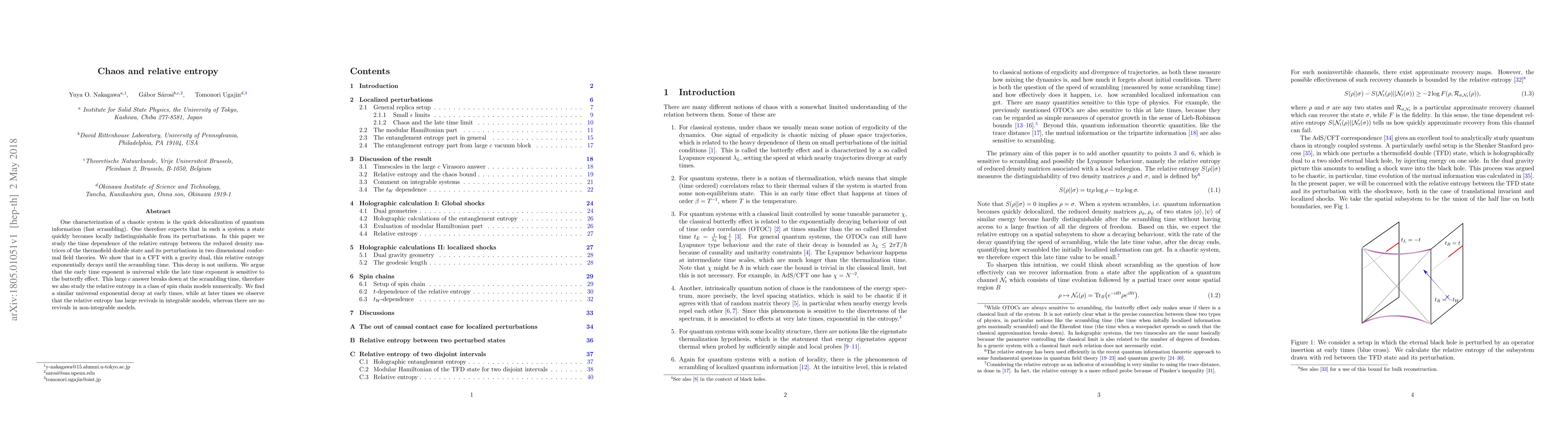 One characterization of a chaotic system is the quick delocalization of quantum information (fast scrambling). One therefore expects that in such a system a state quickly becomes locally indistinguishable from its perturbations. In this paper we study the time dependence of the relative entropy between the reduced density matrices of the thermofield double state and its perturbations in two dimensional conformal field theories. We show that in a CFT with a gravity dual, this relative entropy exponentially decays until the scrambling time. This decay is not uniform. We argue that the early time exponent is universal while the late time exponent is sensitive to the butterfly effect. This large $c$ answer breaks down at the scrambling time, therefore we also study the relative entropy in a class of spin chain models numerically. We find a similar universal exponential decay at early times, while at later times we observe that the relative entropy has large revivals in integrable models, whereas there are no revivals in non-integrable models.