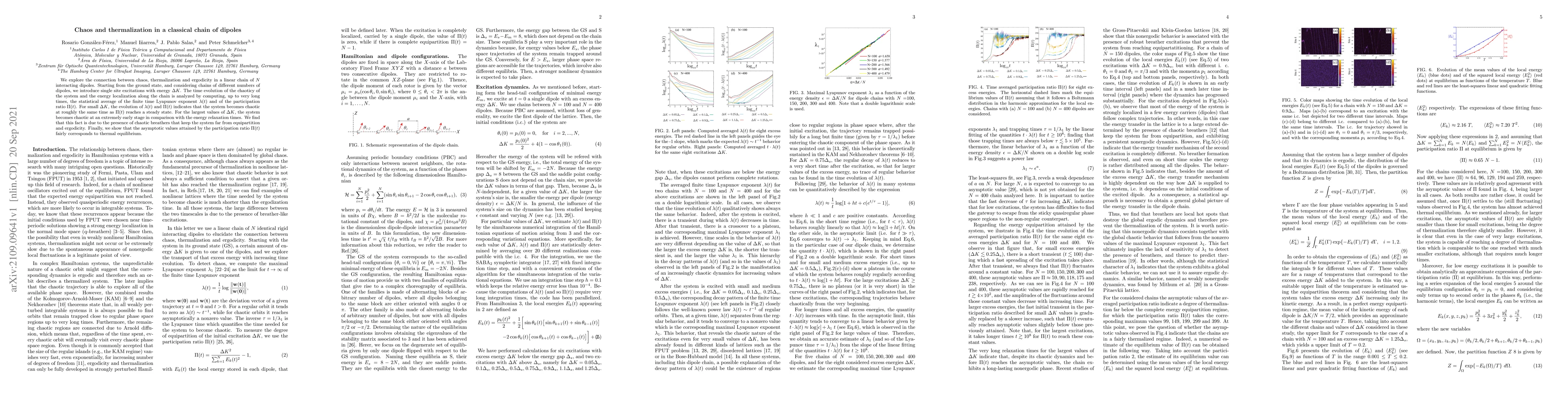 We explore the connection between chaos, thermalization and ergodicity in a linear chain of $N$ interacting dipoles. Starting from the ground state, and considering chains of different numbers of dipoles, we introduce single site excitations with energy $\Delta K$. The time evolution of the chaoticy of the system and the energy localization along the chain is analyzed by computing, up to very long times, the statistical average of the finite time Lyapunov exponent $\lambda(t)$ and of the participation ratio $\Pi(t)$. For small $\Delta K$, the evolution of $\lambda(t)$ and $\Pi(t)$ indicates that the system becomes chaotic at roughly the same time as $\Pi(t)$ reaches a steady state. For the largest values of $\Delta K$, the system becomes chaotic at an extremely early stage in comparison with the energy relaxation times. We find that this fact is due to the presence of chaotic breathers that keep the system far from equipartition and ergodicity. Finally, we show that the asymptotic values attained by the participation ratio $\Pi(t)$ fairly corresponds to thermal equilibrium.