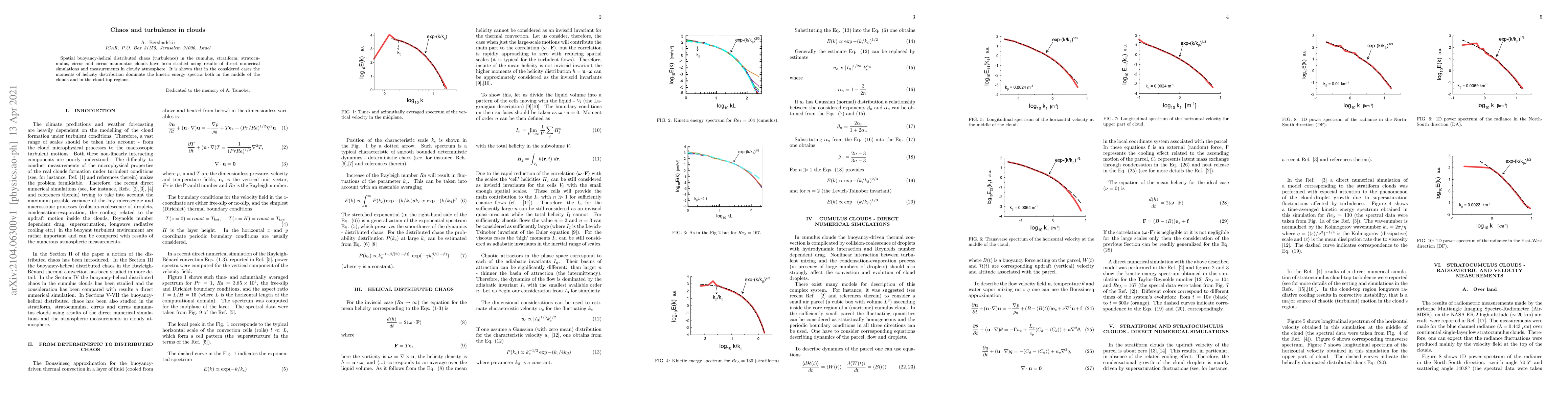 Spatial buoyancy-helical distributed chaos (turbulence) in the cumulus, stratiform, stratocumulus, cirrus and cirrus mammatus clouds have been studied using results of direct numerical simulations and measurements in cloudy atmosphere. It is shown that in the considered cases the moments of helicity distribution dominate the kinetic energy spectra both in the middle of the clouds and in the cloud-top regions.