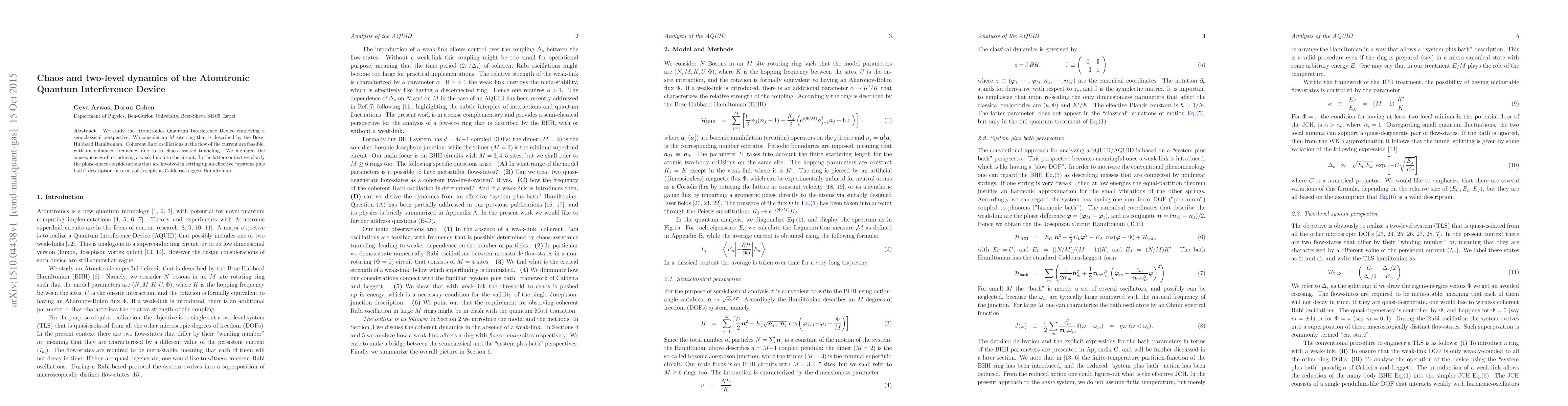 We study the Atomtronics Quantum Interference Device employing a semiclassical perspective. We consider an $M$ site ring that is described by the Bose-Hubbard Hamiltonian. Coherent Rabi oscillations in the flow of the current are feasible, with an enhanced frequency due to to chaos-assisted tunneling. We highlight the consequences of introducing a weak-link into the circuit. In the latter context we clarify the phase-space considerations that are involved in setting up an effective "systems plus bath" description in terms of Josephson-Caldeira-Leggett Hamiltonian.